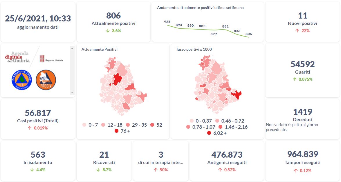 La curva degli attualmente positivi al Covid-19 in Umbria sta lentamente scendendo nelle ultime settimane. Dai dati aggiornati alle ore 10:33 di oggi 25 giugno, 56.817 persone in Umbria risultano in totale positive al virus (+11 rispetto a ieri) , gli attualmente positivi sono 806 (-30 rispetto a ieri), i guariti sono 54.592 (+41 rispetto a ieri).