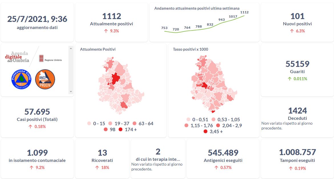 Dai dati aggiornati alle ore 09:36 di oggi 25 luglio, 57.695 persone in Umbria risultano in totale positive al virus (+101 rispetto a ieri) , gli attualmente positivi sono 1.112 (+95 rispetto a ieri), i guariti sono 55.159 (+6 rispetto a ieri).