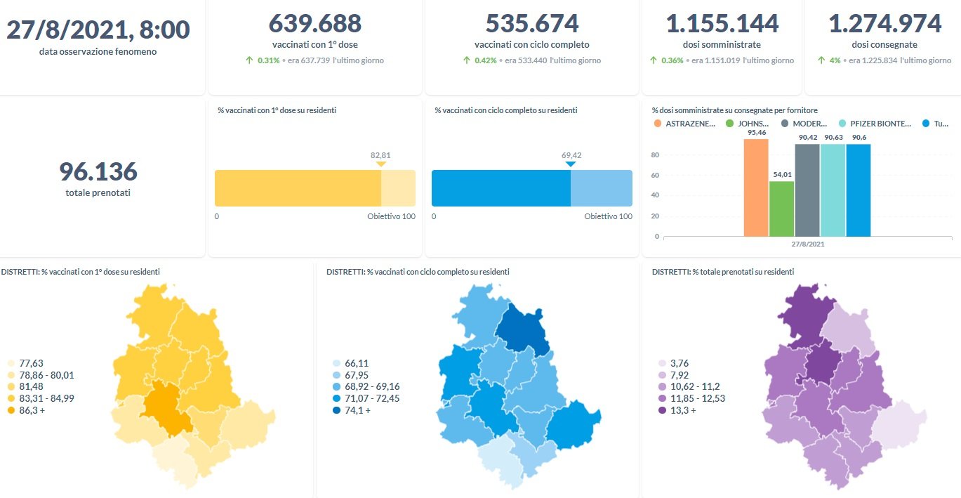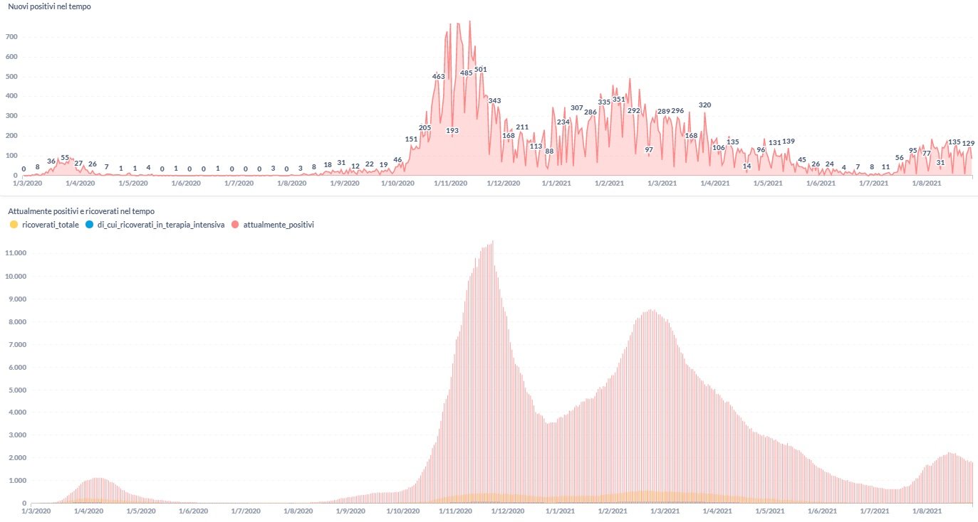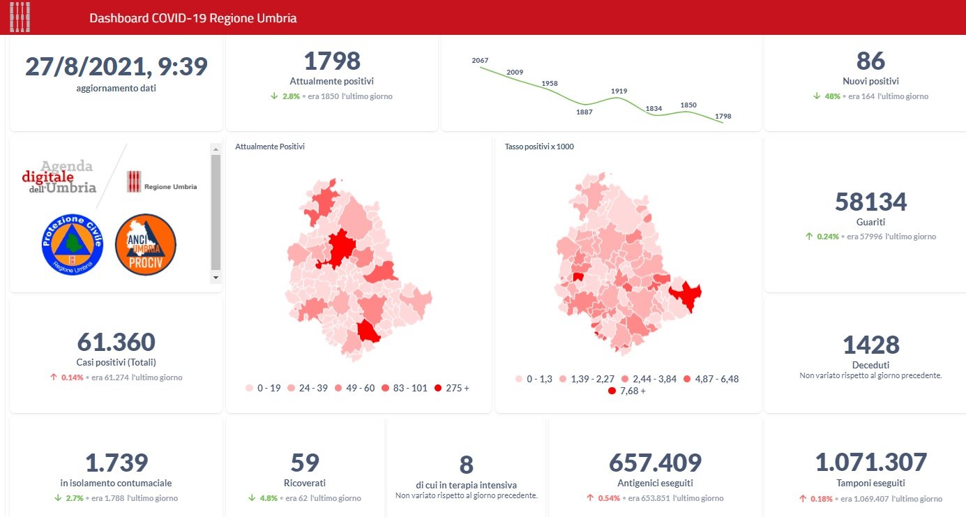 Dai dati aggiornati alle ore 09:39 di oggi 27 agosto, 61.360 persone in Umbria risultano in totale positive al virus (+86 rispetto a ieri), gli attualmente positivi sono 1.798 (-52 rispetto a ieri), i guariti sono 58134 (+138 rispetto a ieri).