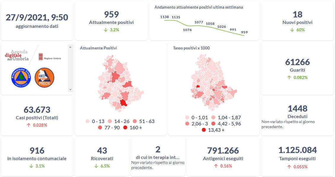Dai dati aggiornati alle ore 09:50 di oggi 27 settembre, 63.673 persone in Umbria risultano in totale positive al virus (+18 rispetto a ieri), gli attualmente positivi sono 959 (-32 rispetto a ieri), i guariti sono 61.266 (+50 rispetto a ieri).