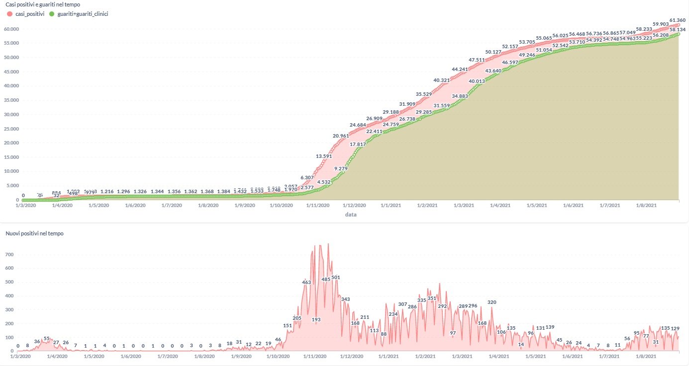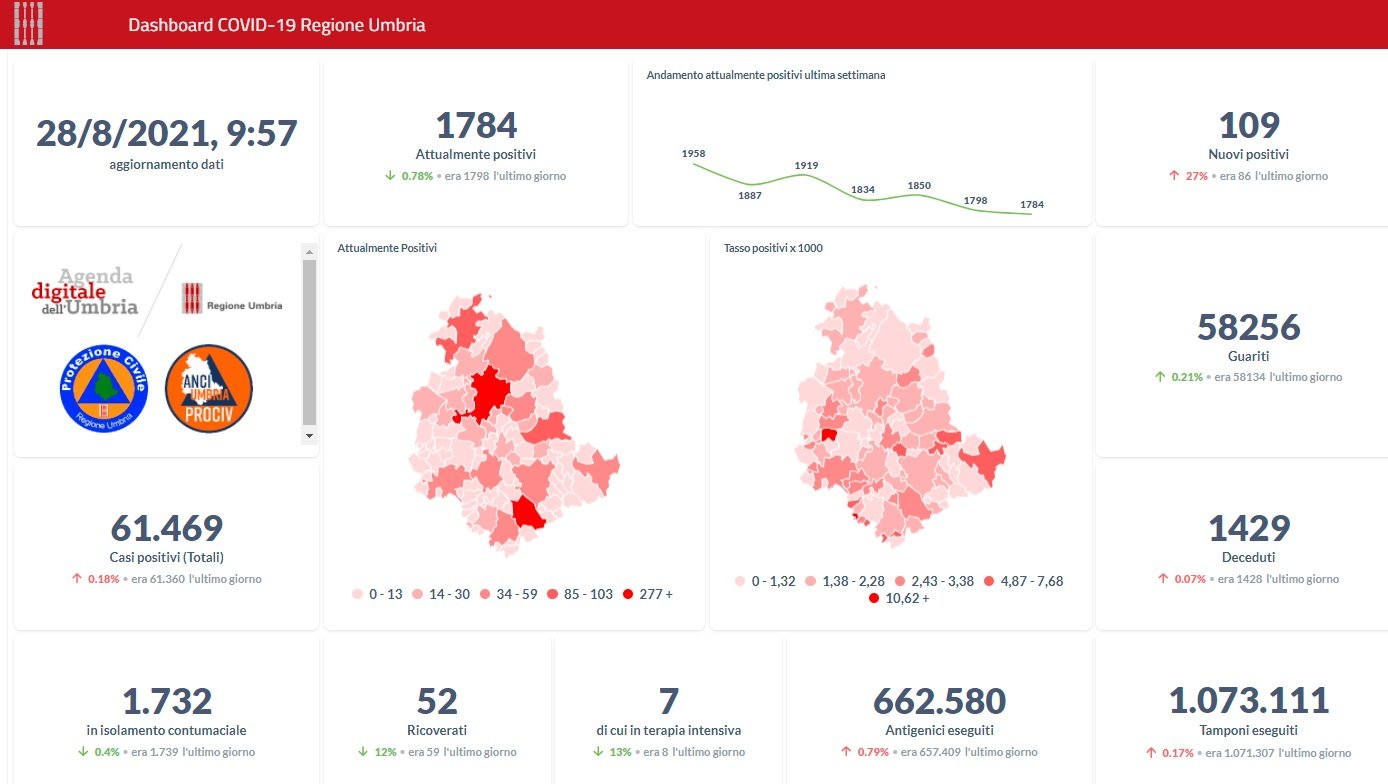 Dai dati aggiornati alle ore 09:57 di oggi 29 agosto, 61.498 persone in Umbria risultano in totale positive al virus (+109 rispetto a ieri), gli attualmente positivi sono 1.784 (-14 rispetto a ieri), i guariti sono 58256 (+122 rispetto a ieri).