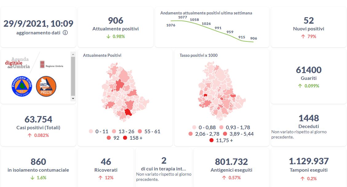 Dai dati aggiornati alle ore 10:09 di oggi 29 settembre, 63.754 persone in Umbria risultano in totale positive al virus (+52 rispetto a ieri), gli attualmente positivi sono 906 (-9 rispetto a ieri), i guariti sono 61.400 (+61 rispetto a ieri).
