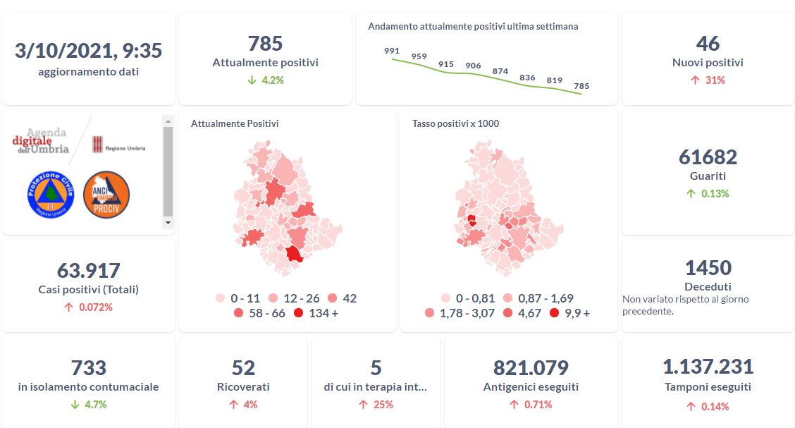 Dai dati aggiornati alle ore 09:35 di oggi 3 ottobre, 63.917 persone in Umbria risultano in totale positive al virus (+46 rispetto a ieri), gli attualmente positivi sono 785 (-34 rispetto a ieri), i guariti sono 61.682 (+80 rispetto a ieri).