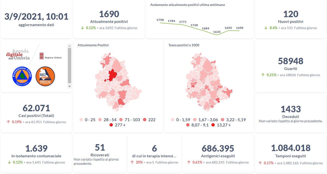 Dai dati aggiornati alle ore 10:01 di oggi 3 settembre, 62.071 persone in Umbria risultano in totale positive al virus (+120 rispetto a ieri), gli attualmente positivi sono 1.690 (-2 rispetto a ieri), i guariti sono 58.948 (+122 rispetto a ieri).