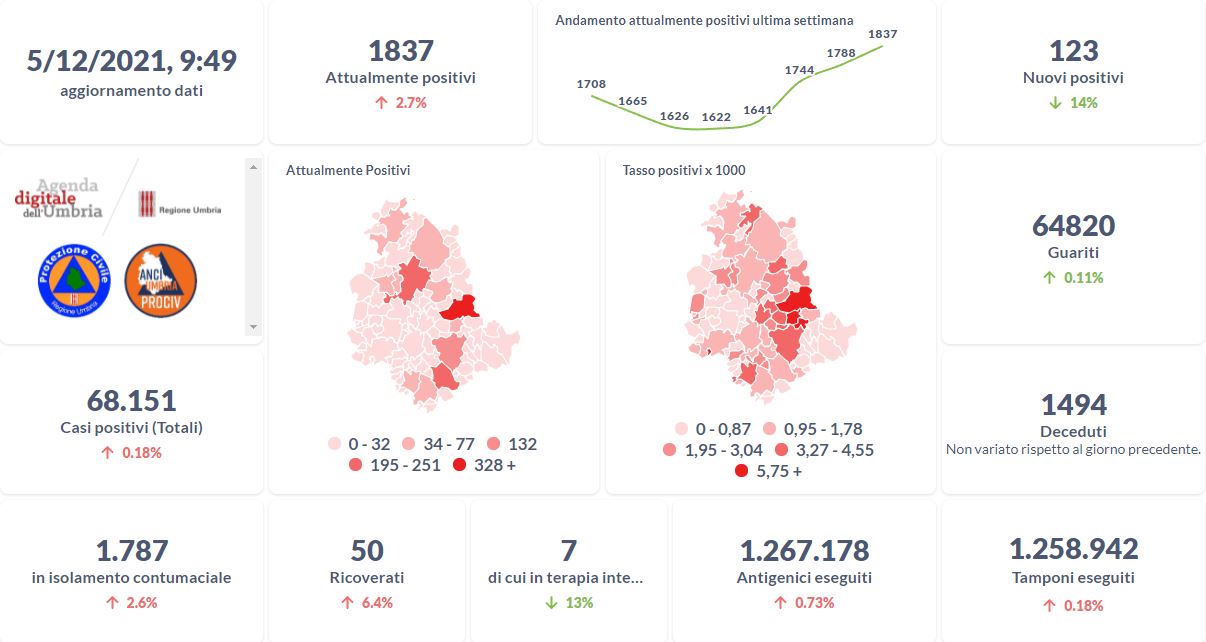 Dai dati aggiornati alle ore 09:49 di oggi 5 dicembre, 68.151 persone in Umbria risultano in totale positive al virus (+123 rispetto a ieri), gli attualmente positivi sono 1.837 (+49 rispetto a ieri), i guariti sono 64.820 (+74 rispetto a ieri).