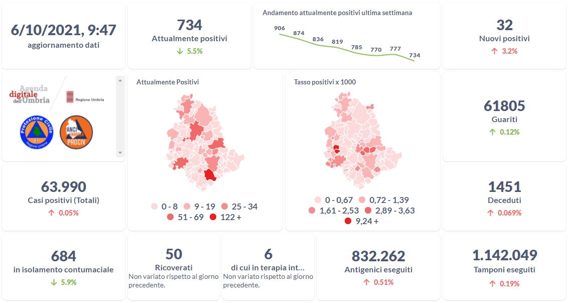 Dai dati aggiornati alle ore 09:47 di oggi 6 ottobre, 63.990 persone in Umbria risultano in totale positive al virus (+32 rispetto a ieri), gli attualmente positivi sono 734 (-43 rispetto a ieri), i guariti sono 61.805 (+74 rispetto a ieri).