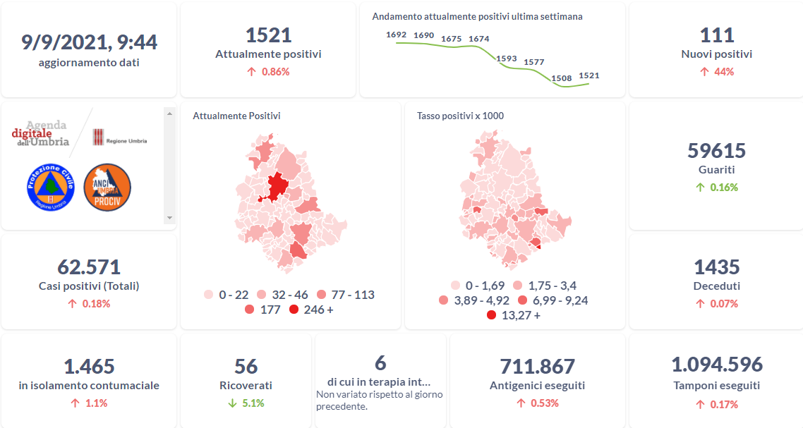Dai dati aggiornati alle ore 09:44 di oggi 9 settembre, 62.571 persone in Umbria risultano in totale positive al virus (+111 rispetto a ieri), gli attualmente positivi sono 1.521 (+13 rispetto a ieri), i guariti sono 59.615 (+97 rispetto a ieri).
