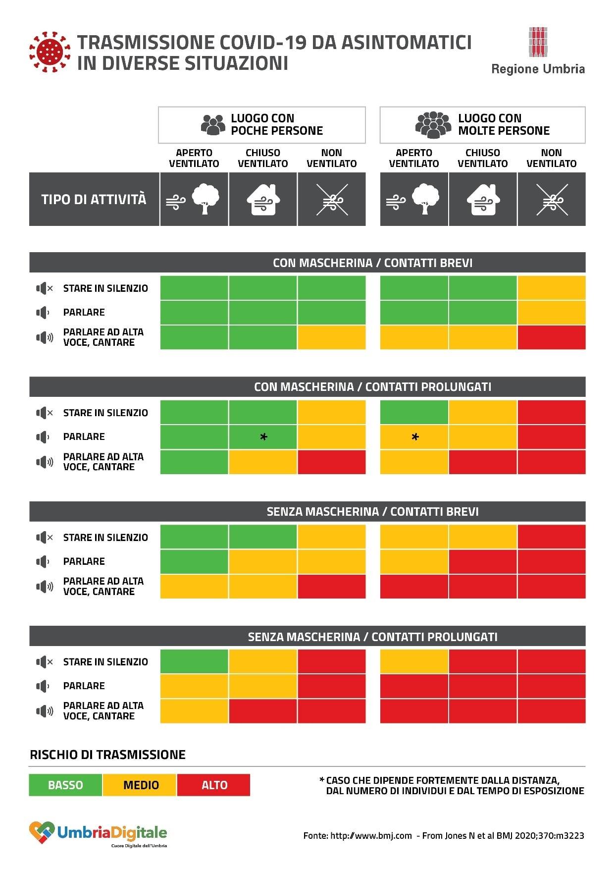 Nella tabella vengono incrociati alcuni fattori per diversi ambienti, “luoghi con poche persone” e “luoghi con molte persone”, ambedue divisi in “all’aperto e ben ventilati”, “al chiuso ben ventilati” e “al chiuso scarsamente ventilati” con differenti attività, quindi persone che stanno in “silenzio”, “parlano” o “gridano e cantano”.