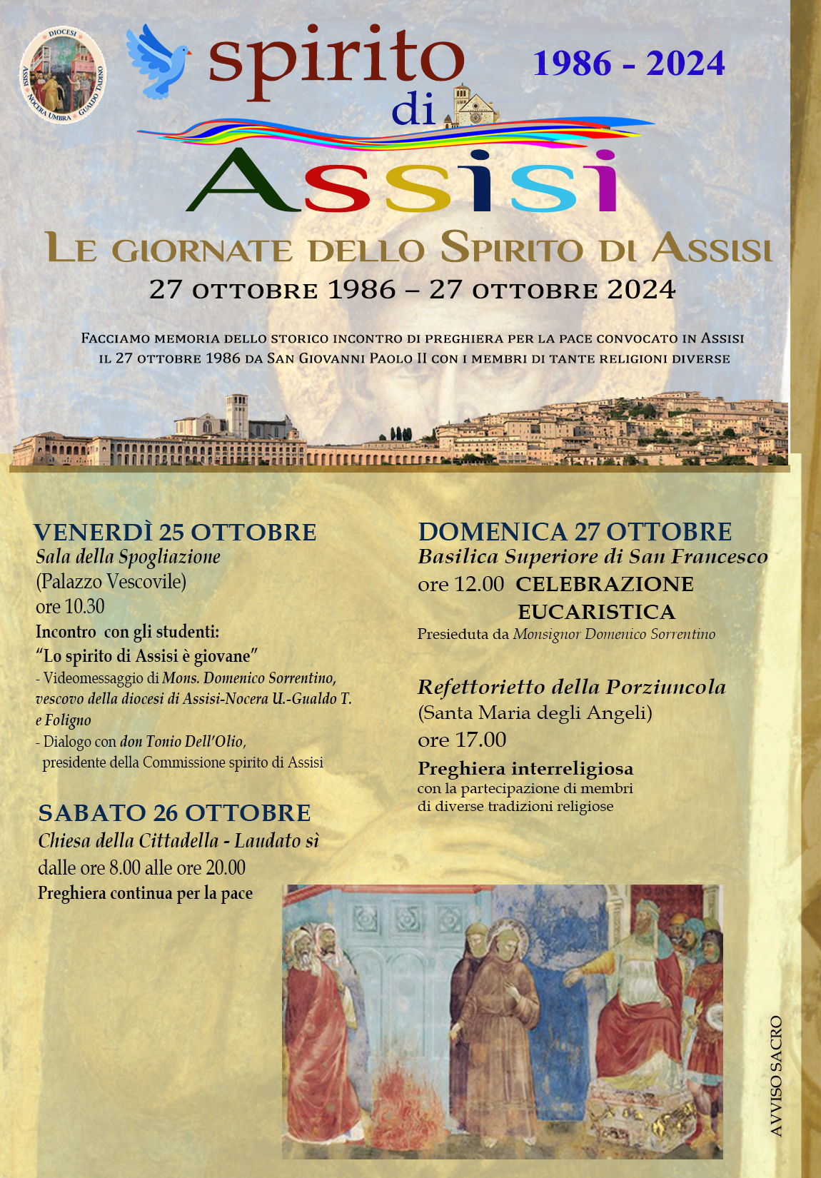 Ricco il programma di quest’anno, che si apre venerdì 25 ottobre alle ore 10.30 nella Sala della Spogliazione del palazzo vescovile di Assisi con un incontro di approfondimento con gli studenti, dal titolo “Lo Spirito di Assisi è giovane”. Dopo il videomessaggio del vescovo Sorrentino ci sarà il dialogo con don Tonio Dell’Olio, presidente della Commissione spirito di Assisi. Sabato 26 ottobre dalle ore 8 alle ore 20 nella chiesa della Cittadella – Laudato sì preghiera continua per la pace. Domenica 27 ottobre alle ore 12, nella Basilica superiore di San Francesco, si terrà la celebrazione eucaristica presieduta dal vescovo Sorrentino. Nel pomeriggio alle ore 17 nel Refettorietto della Porziuncola a Santa Maria degli Angeli è prevista la preghiera interreligiosa con la partecipazione dei membri di diverse tradizioni religiose.