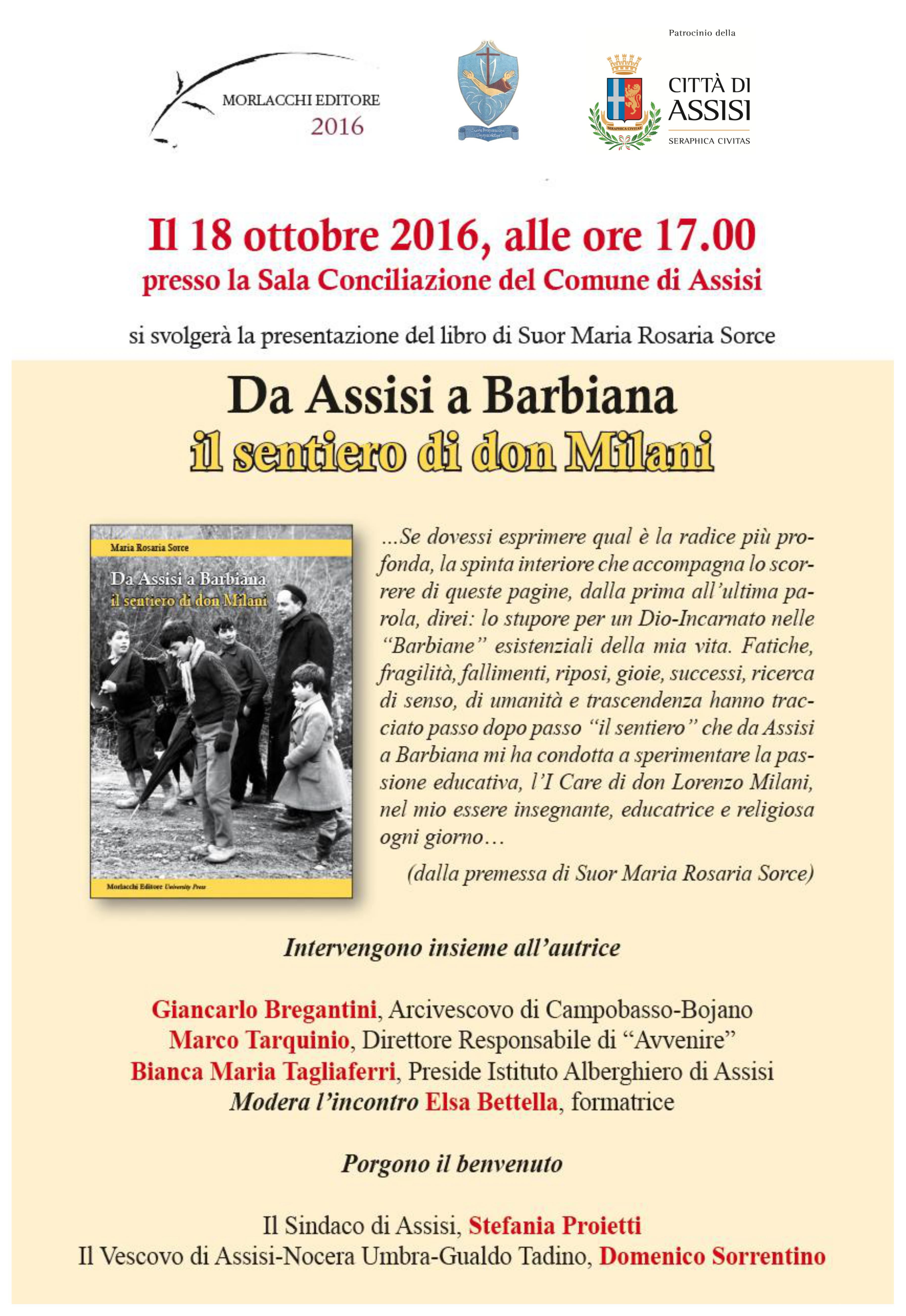 ASSISI – “Da Assisi a Barbiana. Il sentiero di don Milani”. È questo il titolo del libro scritto da suor Maria Rosaria Sorce, insegnante di religione all’istituto Alberghiero molto attiva nel sociale e con i giovani. La presentazione avverrà martedì 18 ottobre alle ore 17 presso la sala della Conciliazione del Comune di Assisi. All’incontro intervengono, insieme all’autrice, Giancarlo Bregantini, arcivescovo di Campobasso-Bojano; Marco Tarquinio, direttore responsabile di “Avvenire”; Bianca Maria Tagliaferri, preside istituto Alberghiero di Assisi. L’incontro è moderato da Elsa Bettella, formatrice. Porgono il loro benvenuto il sindaco di Assisi Stefania Proietti e il vescovo della diocesi di Assisi-Nocera Umbra-Gualdo Tadino, monsignor Domenico Sorrentino.