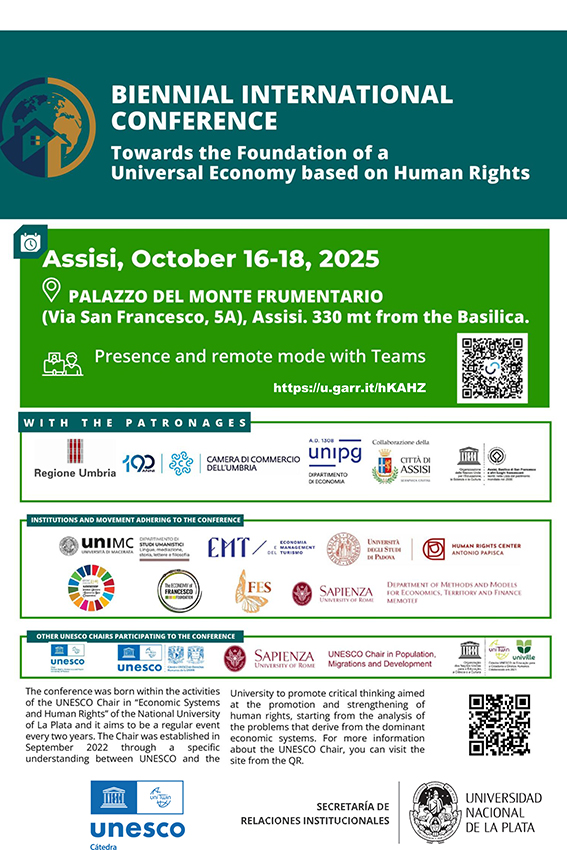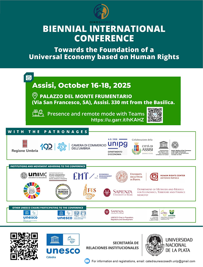 La proposta nasce dalle attività della Cattedra UNESCO dell’Università Nazionale de La Plata in Sistemi Economici e Diritti Umani, in collaborazione con la Regione Umbria, il Comune di Assisi, la Camera di Commercio dell’Umbria e il Dipartimento di Economia dell’Università di Perugia, insieme all’adesione di Enti e Movimenti del settore.