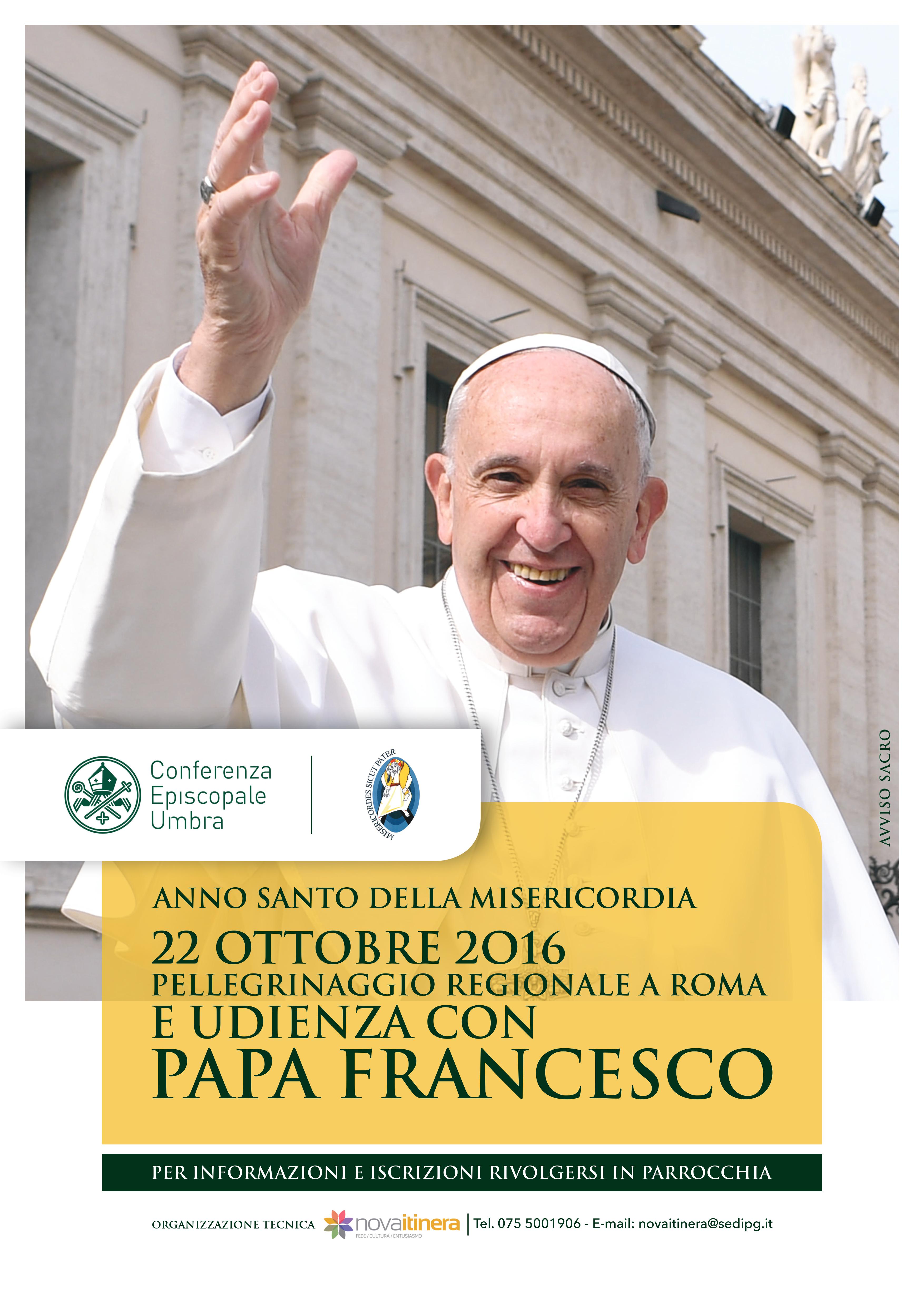 ASSISI – Sono ancora aperte le iscrizioni per partecipare al pellegrinaggio regionale a Roma organizzato nell’anno santo della Misericordia dalla Conferenza episcopale umbra. La diocesi di Assisi – Nocera Umbra – Gualdo Tadino guidata dal vescovo monsignor Domenico Sorrentino si recherà pellegrina a Roma il 22 ottobre per l’udienza speciale con Papa Francesco e per il passaggio della Porta Santa della basilica di San Pietro. Un pellegrinaggio delle otto chiese dell’Umbria che rappresenta un momento importante di spiritualità e fraternità, per vivere in comunione il grande Giubileo della Misericordia e per contraccambiare le recenti visite in Assisi fatte da papa Bergoglio. Le iscrizioni si ricevono nelle varie diocesi contattando direttamente il proprio parroco.
