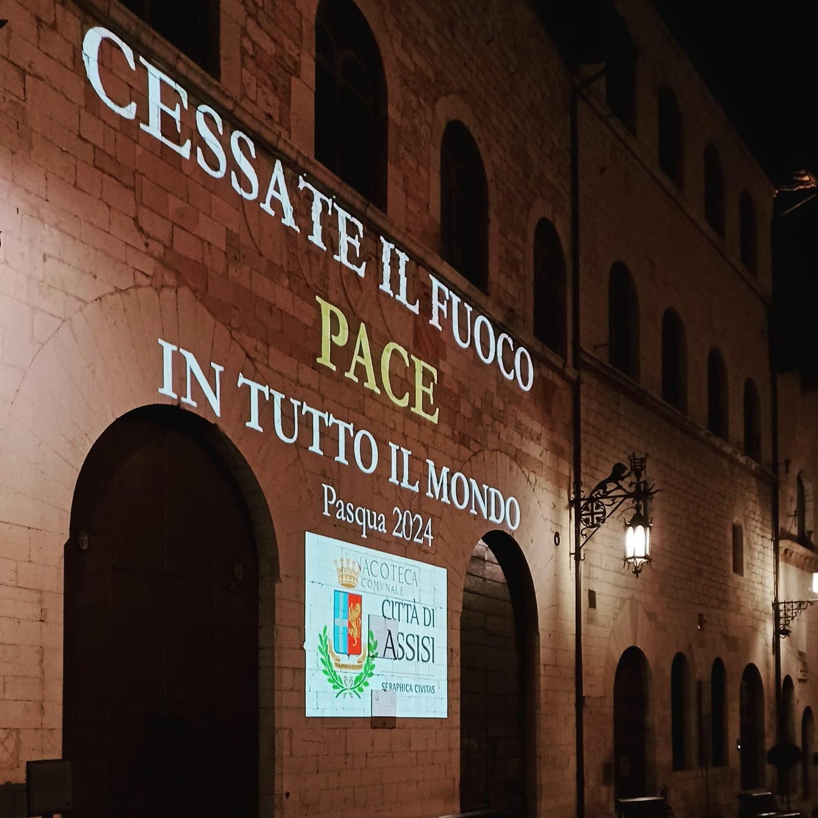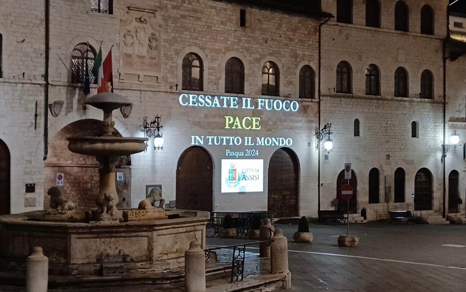 ASSISI – Da Assisi nella notte del Venerdì Santo si è alzato un forte grido di pace. Una scritta impressa sulla facciata del Palazzo Comunale, esattamente sotto le finestre della Sala del Consiglio, il luogo dove vive la democrazia della città, si è accesa subito dopo il passaggio della tradizionale processione.