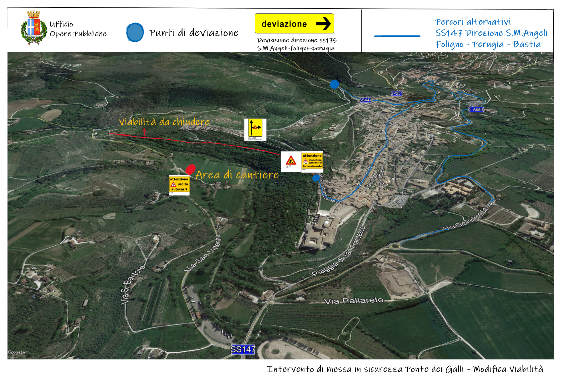 Per quando riguarda le modifiche della viabilità, è stato disposto con ordinanza il divieto di transito e di sosta per tutti i veicoli (ad esclusione ovviamente dei mezzi dell’impresa che compie i lavori) con l’indicazione dell’itinerario alternativo di via Albornoz in entrata e uscita dal centro storico.