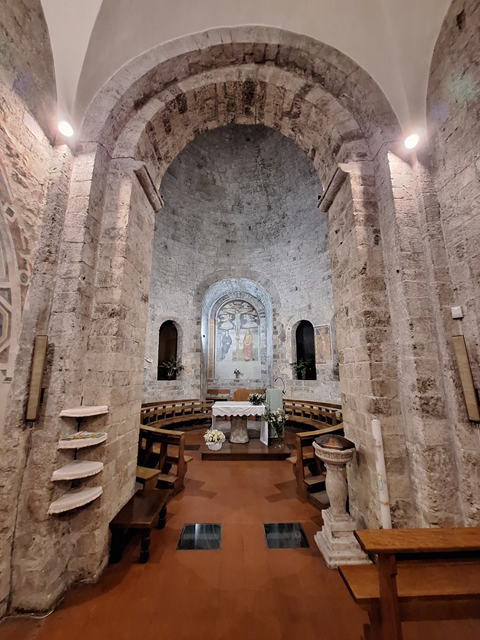 La chiesa di San Salvatore è il monumento medievale più caratteristico di Terni, situata in pieno centro storico, vicino al Palazzo Comunale. La più antica menzione riferibile alla chiesa è contenuta nell’elenco dei possedimenti acquisiti dall’abate Berardo I di Farfa nel distretto di Terni tra il 1047 e il 1089, dove per l’anno 1065 è citata una “cella Sancti Salvatoris in civitate teramnana”. L’edificio è caratterizzato da una pianta peculiare: una singola navata divisa in due campate, un corpo cilindrico con cupola e un’abside quadrangolare. La cupola presenta un oculo aperto, che richiama architetture classiche come il Pantheon di Roma. Una tradizione erudita ha erroneamente identificato la rotonda come un tempio romano dedicato al Sole, smentita dalle indagini archeologiche del 1909 che hanno rivelato una domus romana sottostante, databile tra il I sec. a.C. e il I sec. d.C. Nel XIV secolo fu aggiunta la cappella Manassei, decorata con affreschi trecenteschi. Nel XVII secolo fu costruita la cappella Filerna, dedicata a San Vincenzo, con affreschi di Andrea Polinori e Ludovico Carosi, danneggiata durante la Seconda Guerra Mondiale. Nella rotonda restano frammenti di affreschi dal Duecento al Cinquecento, tra cui un San Paolo del XIII secolo. Nella parete absidale è affrescata una Crocifissione, attribuita alla scuola del Perugino. Visite a cura degli Apprendisti Ciceroni del Liceo Scientifico “Renato Donatelli” di Terni.