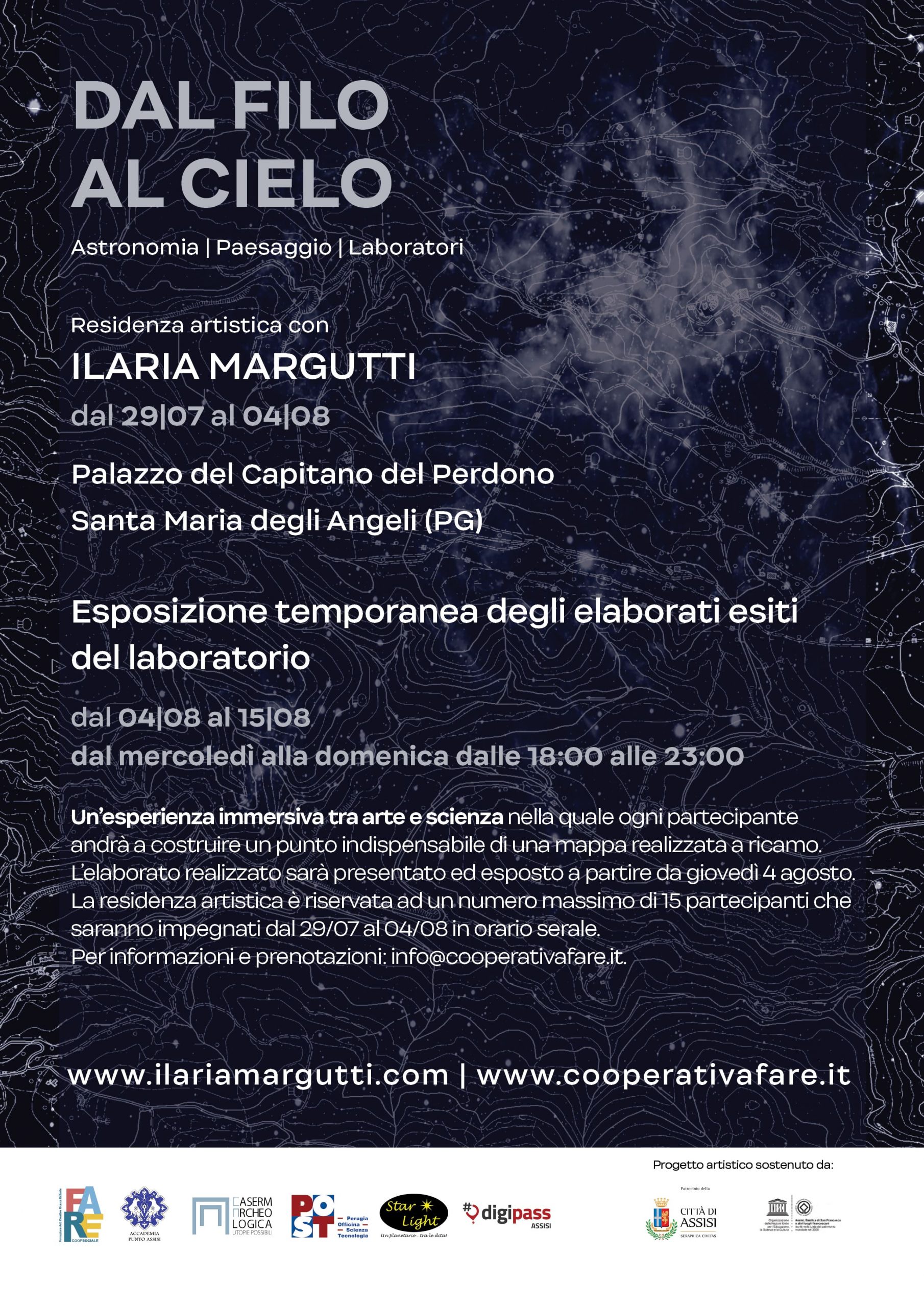 La residenza artistica di Ilaria Margutti, invitata a Santa Maria degli Angeli da FARE cooperativa sociale, vuole accompagnare i partecipanti in un percorso che trova il suo inizio nell’osservazione della volta stellata assieme al gruppo di StarLight un planetario tra le dita APS e prosegue in una passeggiata guidata tra natura e paesaggio urbano. Da qui, un laboratorio e un dialogo intellettuale, guidato da Ilaria e coadiuvato da mani sapienti provenienti dal mondo del ricamo con l’Accademia Punto Assisi, che permetterà di raccontar-si unendo i propri fili all’infinita distanza dal cielo, attraverso una manualità individuale che convoglierà in un lavoro collettivo e trasversale a tutte le età, alle identità di genere e a tutte le culture. Costituito da tanti tasselli che potranno essere decodificati solo nel loro insieme.