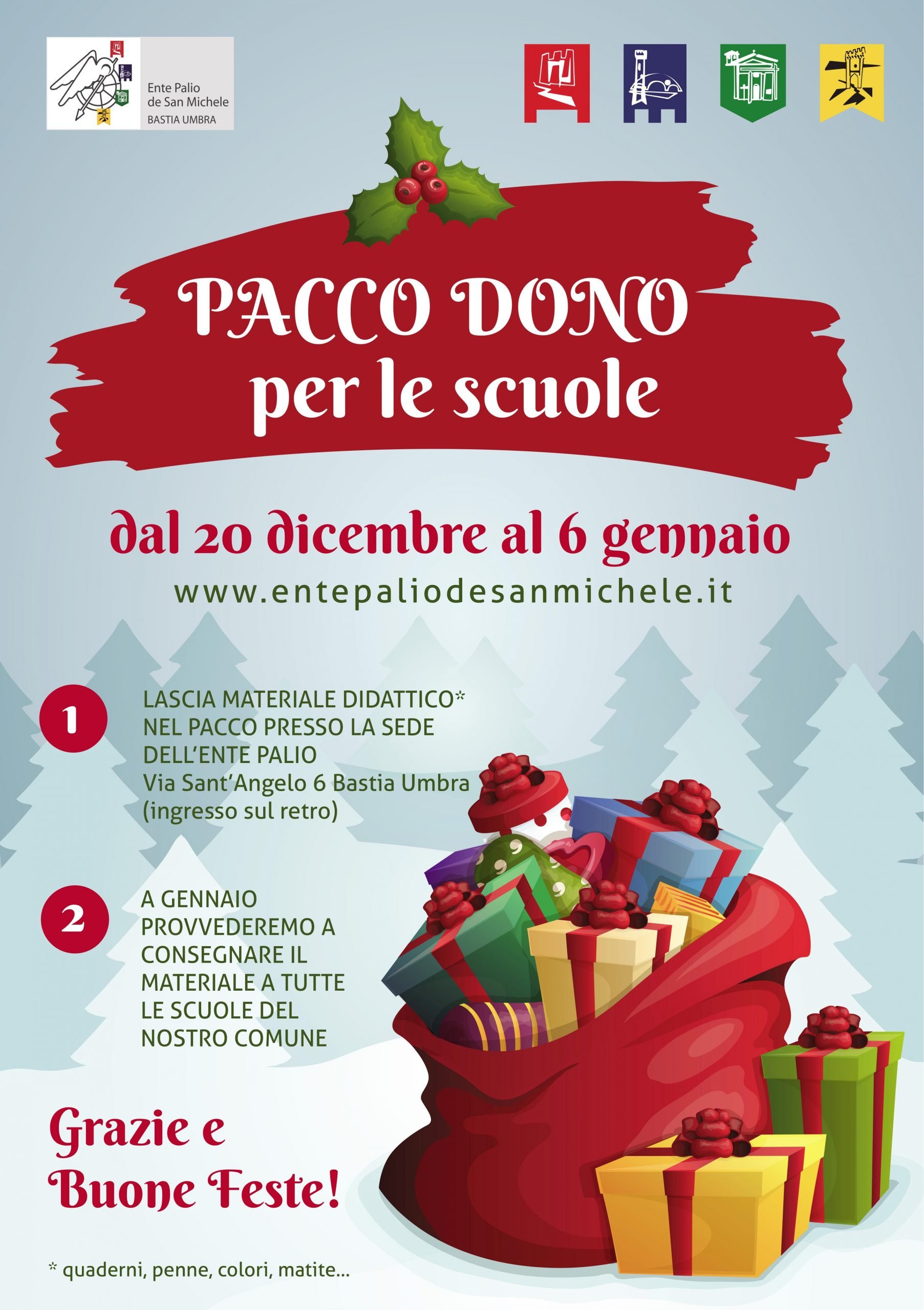 Da domenica 20 dicembre 2020 a mercoledì 6 gennaio 2021, verrà installato un grande scatolone fuori dalla sede dell’Ente Palio, in via Sant’Angelo6 (ingresso sul retro), dove l’intera comunità potrà contribuire in forma anonima al Pacco Dono Natalizio donando materiale didattico: quaderni, penne, astucci, borse e colori…