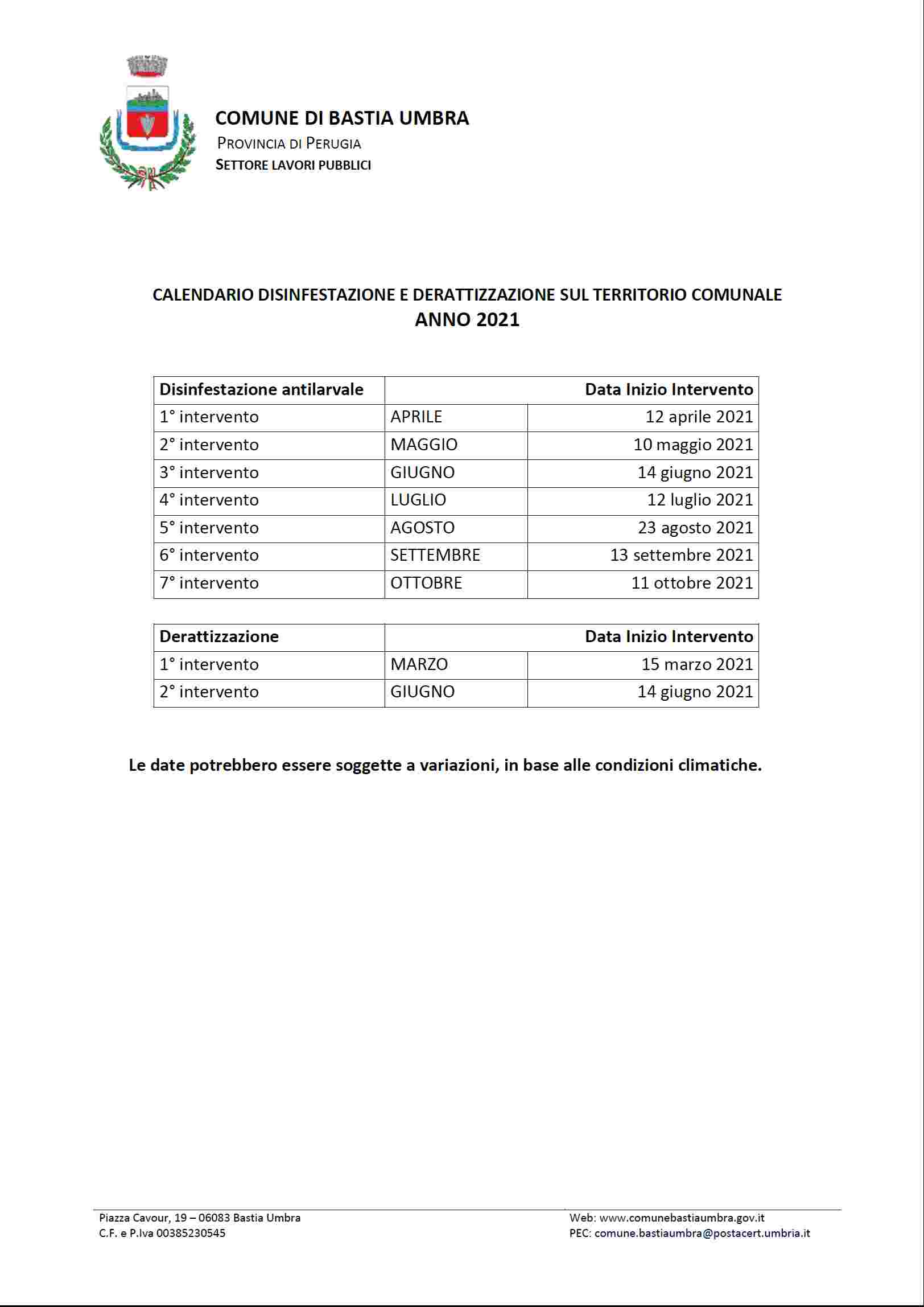 Il calendario degli interventi è già disponibile dall’inizio dell’anno, sul sito istituzionale www.comune.bastia.pg.it