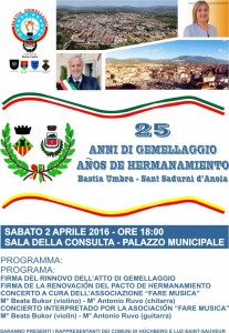 Domani, sabato  2 aprile 2016 sarà firmato il rinnovo del patto di gemellaggio tra i Comuni di Bastia Umbra e Sant Sadurnì d’Anoia (Catalogna), un rapporto di scambi e collaborazione internazionale che compie 25 anni. La cerimonia si terrà alle ore 18,00,  nella Sala della Consulta dove sarà siglato il rinnovo del Patto di Gemellaggio dal Sindaco di Bastia Umbra Stefano Ansideri e dal sindaco di Sant Sadurnì d’Anoia Maria Rosell y Medall.