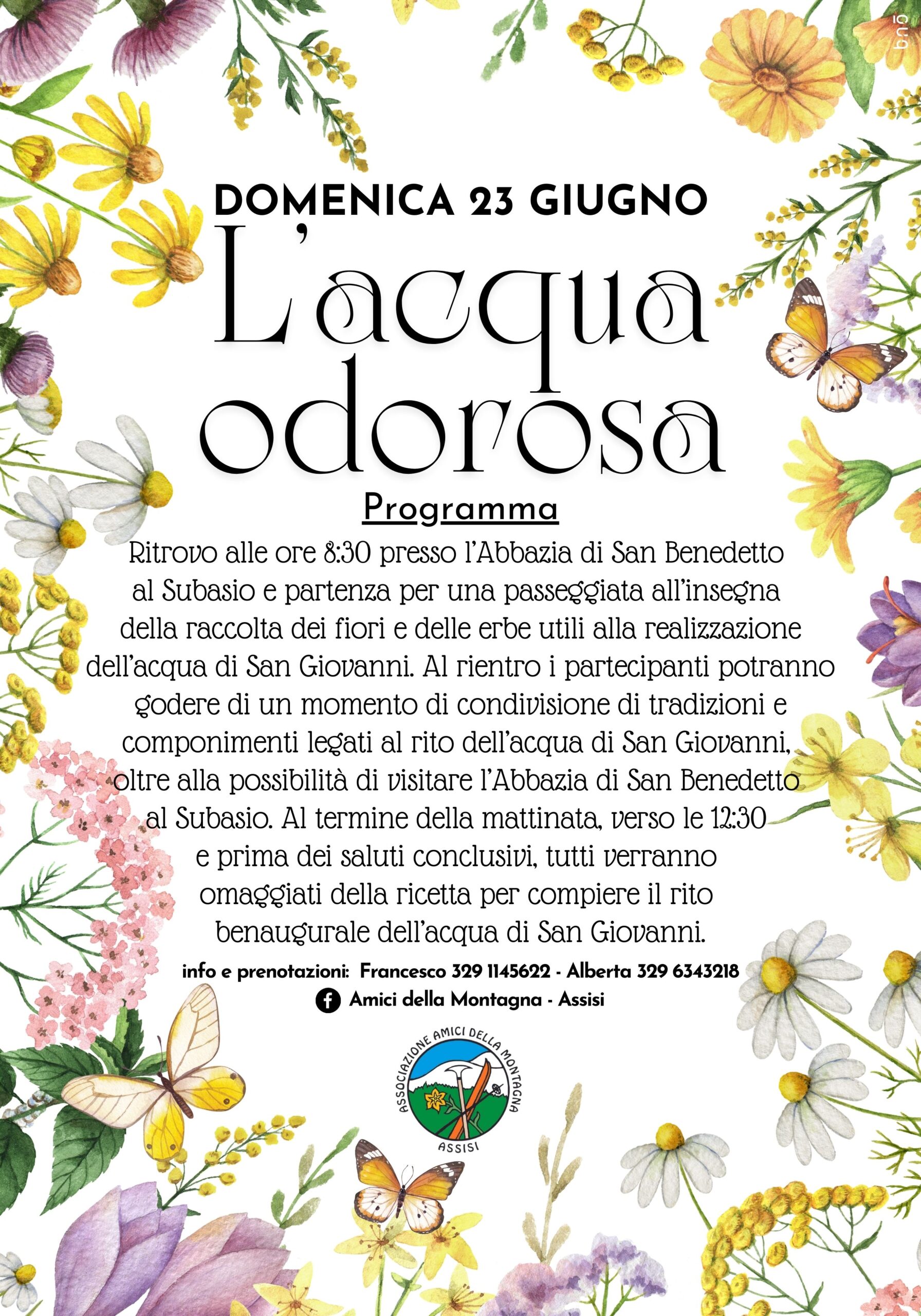 Il programma prevede un primo momento che ha inizio alle ore 8:30 presso l’Abbazia di San Benedetto al Subasio da dove avrà inizio una passeggiata all’insegna della raccolta dei fiori e delle erbe aromatiche utili alla realizzazione dell’acqua odorosa. Successivamente, si fa ritorno all’Abbazia, che grazie all’ospitalità del custode Alberto Cisco è accessibile e visitabile in tutta la sua bellezza, dove si vivrà un piacevole momento di condivisione di tradizioni e componimenti legati al rito dell’acqua odorosa. Prima della conclusione della mattinata, previstamper le ore 12:30 circa, i partecipanti, verranno omaggiati della ricetta dell’Associazione Amici della Montagna di Assisi, utile a compiere il rito dell’acqua odorosa. Per ricevere maggiori informazioni è possibile contattare il 329 6343218.