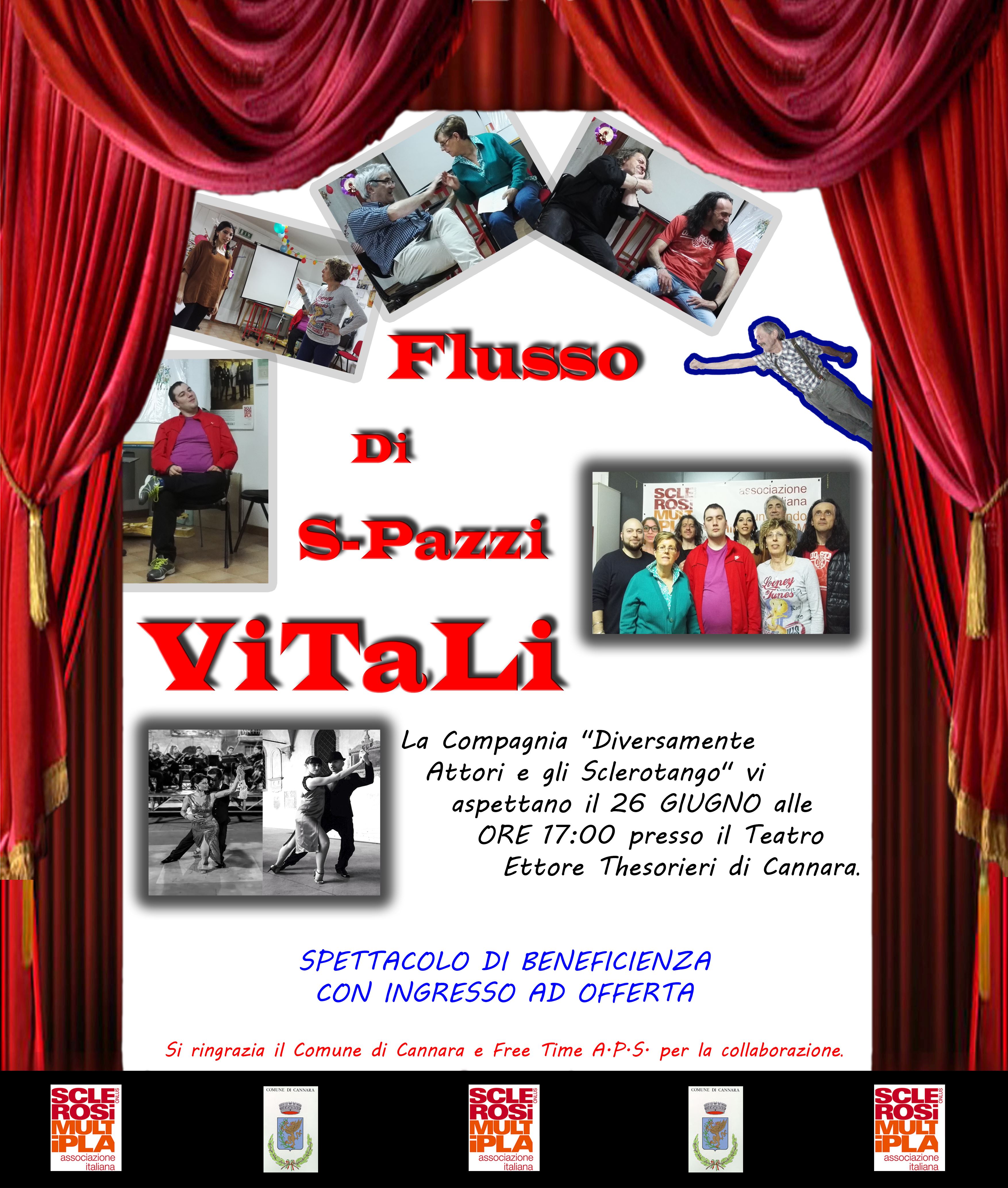 Domenica 26 Giugno alle ore 17:00 presso il Teatro Comunale ‘Ettore Thesorieri’ di Cannara la Compagnia Teatrale “Diversamente Attori” e gli “Sclerotango” porteranno in scena uno spettacolo di beneficienza a sostegno dell’AISM – Associazione Italiana Sclerosi Multipla ONLUS – sezione Provinciale di Perugia, Presidente Luca Conte – dal titolo “Flusso di S-Pazzi Vitali”.