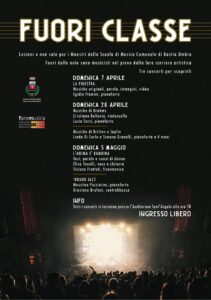 Domenica 5 Maggio alle ore 18, presso l’Auditorium Sant’Angelo di Bastia Umbra, terzo ed ultimo appuntamento con FUORI CLASSE, un programma di eventi realizzato a cura dell’Associazione Faremusica in collaborazione con l’Ufficio Cultura del Comune di Bastia Umbra, in cui sono protagonisti i Maestri della Scuola di Musica Comunale.