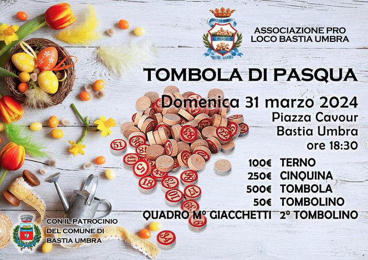 Al termine della Rinchinata si potrà partecipare alla tradizionale Tombola di Pasqua, organizzata dalla Ass. Pro Loco di Bastia Umbra in collaborazione con il Comune di Bastia Umbra. Le cartelle per partecipare alla Tombola si potranno acquistare sul posto dove saranno presenti i volontari dell’Associazione. Sia la Rinchinata che la Tombola si svolgeranno in piazza Cavour, nello spazio antistante il Municipio. Le due statue di Maria saranno portate in piazza Cavour partendo dalla piccola Chiesa della Madonna del Pantano situata in Via San Michele Arcangelo e le statue del Salvatore usciranno dalla Chiesa di San Michele.