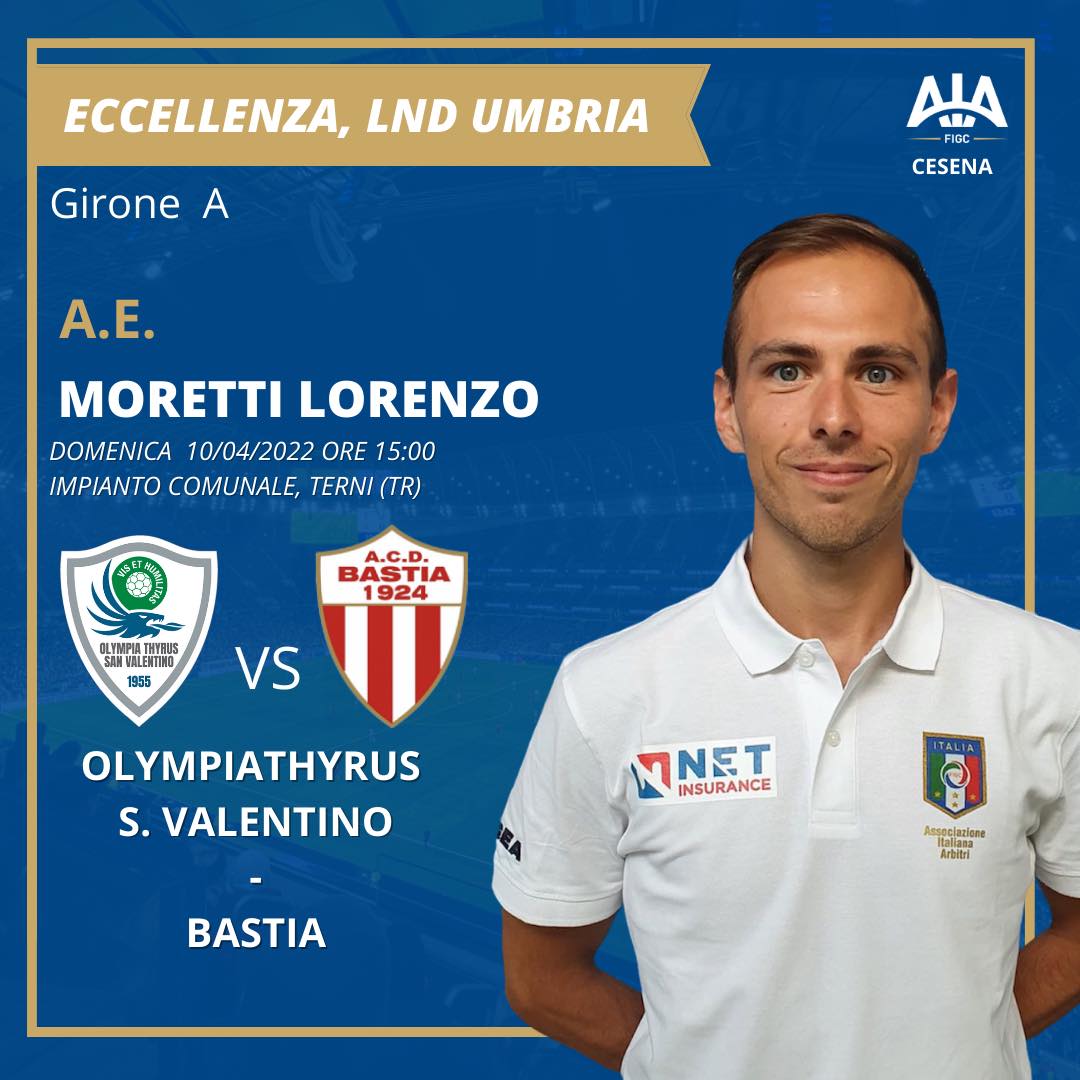 BASTIA UMBRA – Ad arbitrare la 30^ giornata di ritorno, Olympia Thyrus S. Valentino vs Bastia 1924, sfida salvezza in calendario domenica 10 Aprile (ore 15:00) al campo comunale “Ovidio Laureti” di Terni, sarà il signor Lorenzo Moretti della sezione di Cesena. Sarà assistito nell’occasione da Jacopo Vagnetti e Matteo Salari entrambi della sezione di Perugia.