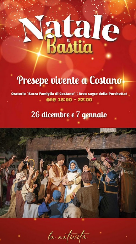 Il 26 dicembre e il 7 gennaio per la prima volta si realizzerà il Presepe vivente anche a Costano, organizzato dall’Oratorio “Sacra famiglia”, dalle 17.00 alle 22.00. Dall’Oratorio via Duilio Lunghi, un percorso che permetterà al visitatore di scorgere le varie ambientazioni e le botteghe dei vecchi mestieri, soffermandosi infine alla grotta della Natività.