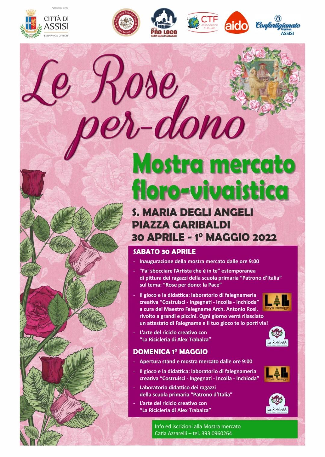 Luogo principale dell’esposizione floro-vivaistica e degli eventi che caratterizzeranno Le Rose per Dono 2022, sarà Piazza Garibaldi a Santa Maria degli Angeli. Per informazioni sull’evento e per le iscrizioni alla mostra mercato, è possibile contattare Catia Raffaella Azzarelli al numero telefonico 393.09.60.264.