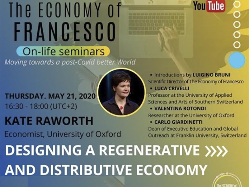 ROMA 18 MAG  Grande successo per il ciclo di seminari in diretta streaming sui canali social di Economy of Francesco. Moving towards a post-Covid better world è l’iniziativa online, organizzata dal comitato scientifico The Economy of Francesco, per approfondire alcuni dei temi e delle sfide dell’economia di oggi. Giovedì 21 maggio alle 16.30 in occasione della settimana Laudato Si’, ci sarà il terzo appuntamento dal titolo Designing a regenerative and distributive economy, con la ricercatrice e docente inglese Kate Raworth, tra i primi dieci economisti più influenti al mondo secondo The Guardian. L’evento sarà visibile sul canale YouTube “The Economy of Francesco”.