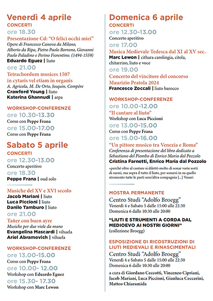 Società del Liuto, Comune di Spello, Comune di Assisi, Comune di Perugia, Provincia di Perugia, Parrocchia Collegiata Santa Maria Maggiore di Spello, Associazione Turistica Pro Spello Aps-Ets, Circolo San Silvestro APS, Istituto Comprensivo Galileo Ferraris, La Marmellata di More APS, Associazione I Borghi più Belli d’Italia Umbria. Per ricevere maggiori informazioni è possibile rivolgersi al contatto whatsapp 3488722313, visitare i social Ensemble Micrologus e scrivere a info@micrologus.it o info@centrostudiadolfobroegg.it