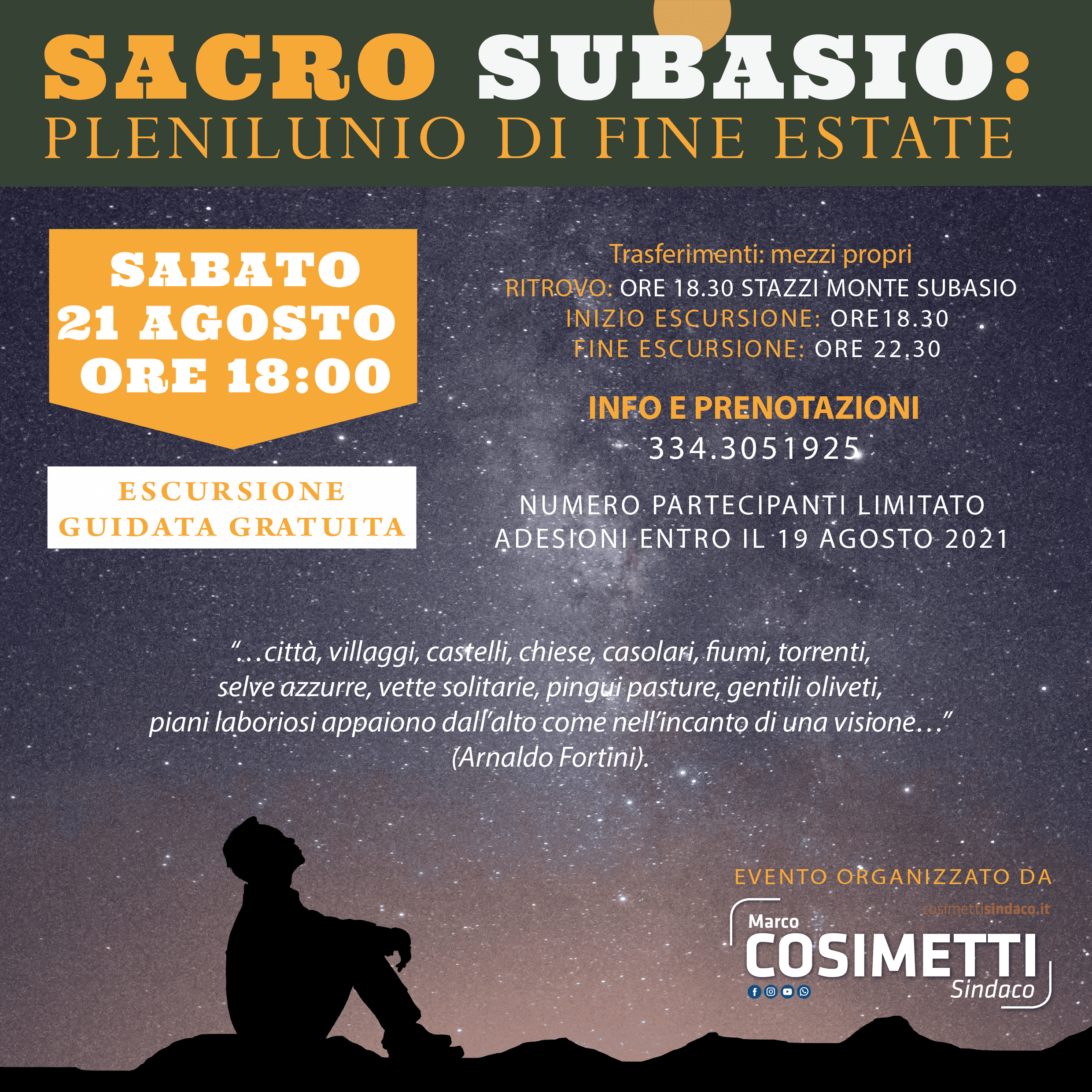 Un evento per promuovere la conoscenza dell’ambiente e della storia del monte Subasio in occasione del plenilunio di fine estate. Nasce con questo spirito l’escursione guidata gratuita che sabato 21 agosto porterà i partecipanti fino alla vetta del “Sacro Monte”, organizzata dal candidato sindaco Marco Cosimetti. Si tratta di una escursione ad anello con partenza alle ore 18 dal parcheggio degli Stazzi, che si sviluppa su carrarecce e sentieri ben tracciati. Si proseguirà dai prati sommitali fino alla vetta geografica del Subasio (1.290 metri) tra magnifici panorami e paesaggi da incorniciare, alla presenza di tre esperti che uniranno conoscenze storiche, ambientali e astronomiche. Giuseppe Bambini, infatti, darà un nome alle luci tremolanti che indicano borghi e rocche, alle infinite cime della lunghissima catena dell’appennino umbro marchigiano, mentre la luna sorge in opposizione al sole che tramonta; poi sulla vetta Prospero Calzolari spiegherà perché il Subasio è da sempre un “Sacro Monte” e, quando il cielo finalmente sarà oscuro, Fosco Ficola con il puntatore laser indicherà stelle e costellazioni. La fine dell’escursione è prevista per le 22.30 e ogni trasferimento sarà effettuato con mezzi propri, così come ogni partecipante dovrà portare con sè viveri e acqua. “Dopo la passeggiata in città seguendo le opere di Arnaldo Fortini, ho voluto organizzare un secondo evento dedicato questa volta alla montagna, l’altro grande patrimonio del nostro territorio”, ha spiegato Marco Cosimetti. “Sono una persona concreta, a cui piace passare dalle parole ai fatti: anche questo evento vuole portare i cittadini, assisani e non, a vivere il territorio nelle sue molteplici forme ed esperienze, offrendo un’occasione gratuita di conoscenza, aggregazione e socialità nel solco di quelle politiche di promozione del territorio e valorizzazione di tutto il suo potenziale che ho sempre illustrato in queste ultime settimane. Il tutto sempre alla presenza di esperti e personale qualificato”.Le prenotazioni devono pervenire entro giovedì 19 agosto telefonando al numero 334.3051925 (posti limitati)