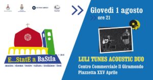 “E…state a Bastia” si sposterà Giovedì 1° Agosto al Centro Commerciale “Il Giramondo” – Piazzetta XXV Aprile (ore 21.00). Protagonisti della serata saranno Luisa e Marco Lombardoni; i due artisti – un duo acustico composto da chitarra e voce – si esibiranno proponendo in repertorio cover italiane e internazionali tra le quali i più grandi successi di Mina e dei Beatles.