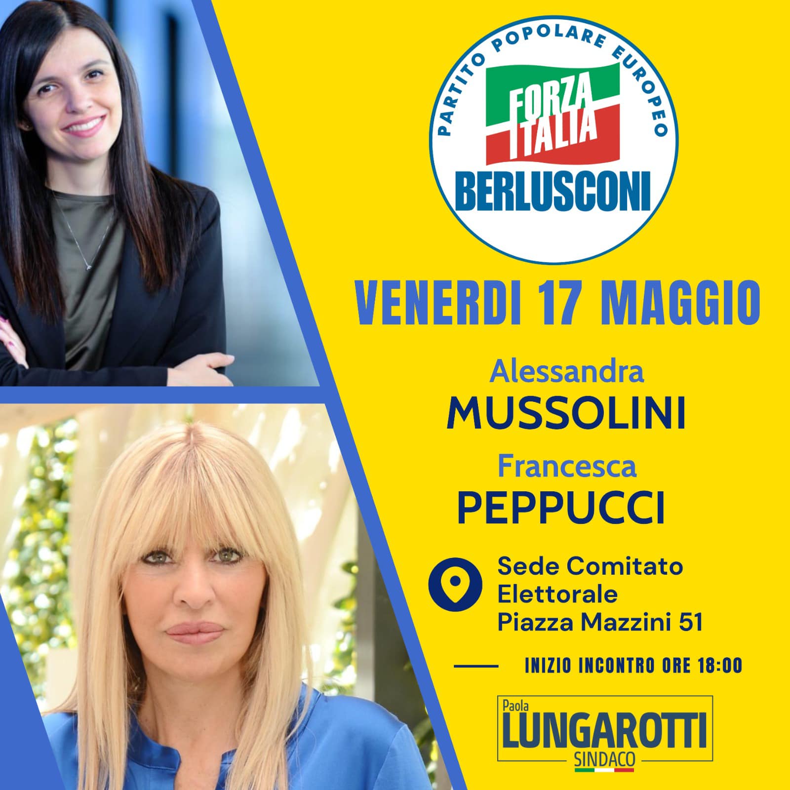 Le Europarlamentari di Forza Italia Alessandra Mussolini e Francesca Peppucci saranno presenti venerdì 17 maggio alle ore 18.00 a sostegno della candidatura di Paola Lungarotti presso la sede del comitato elettorale di Piazza Mazzini 51 a Bastia Umbra.