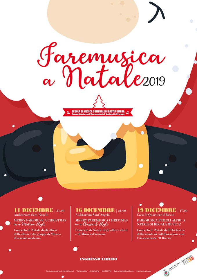 Oggi, mercoledì 11 dicembre dalle 21.00 alle 22.30 Merry Faremusica Christmas In a Modern Style, Concerto di Natale degli allievi delle classi e dei gruppi di Musica d’insieme moderna della Scuola di Musica Comunale di Bastia Umbra, presso Auditorium di Sant’Angelo in Piazza Umberto I.