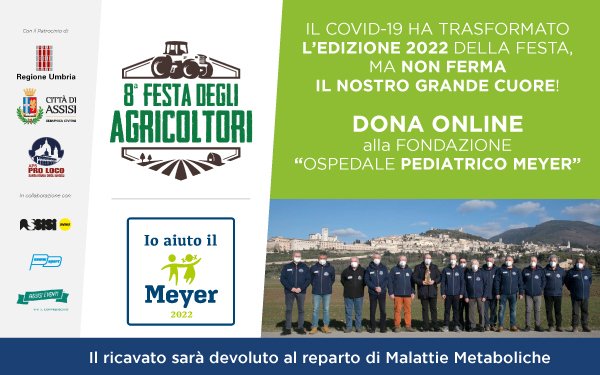 Come già l’anno scorso, anche quest’anno l’iniziativa promossa dal Comitato della Festa degli Agricoltori su idea di Alessio Castellani, assisano e da sempre vicino alla solidarietà, non si terrà in presenza ad Assisi, ma verrà organizzata un’iniziativa itinerante che possa aiutare la Fondazione Meyer a sostegno del reparto di Malattie Metaboliche dell’ospedale pediatrico di Firenze. Se nel 2021, infatti, gli agricoltori erano invitati a inviare le foto del loro mezzo, quest’anno la manifestazione, con il patrocinio della Regione Umbria e della Città di Assisi  e con il supporto della Pro loco di Santa Maria degli Angeli, andrà direttamente dagli agricoltori del Centro Italia.
