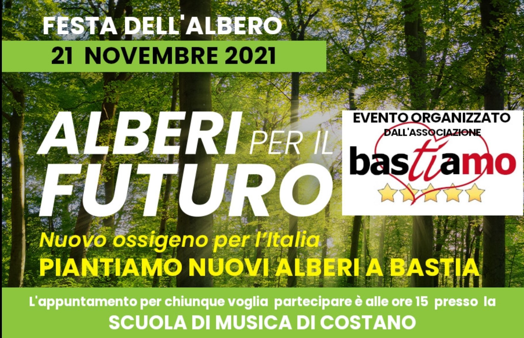 L’associazione BasTiAmo anche quest’anno, in occasione della giornata nazionale dell’albero che si tiene domenica 21 novembre, pianterà alcuni alberi presso il parco della Scuola Musica di Costano. Chiunque voglia unirsi ai festeggiamenti, potrà partecipare e dare una mano a rendere più verde la nostra comunità, consapevoli che ogni albero piantato, ogni nuovo parco, è utile non solo a rendere la nostra città più salubre e vibibile, ma anche per mitigare gli effetti del cambiamento climatico. La festa dell’albero è la festa di tutti! Per chiunque vorrà partecipare all’evento, l’appuntamento è alle ore 15 presso il giardino retrostante la scuola di musica. Per maggiori informazioni visitate il nostro sito AssociazioneBastiamo.it.