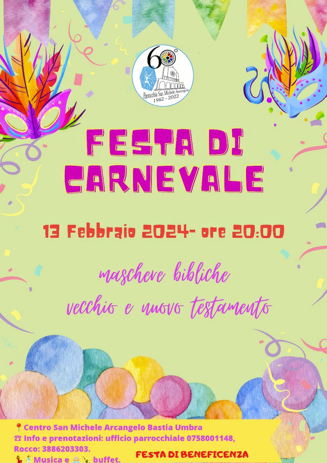 Martedì 13 febbraio 2024 alle ore 20,00 al Centro San Michele di Bastia Umbra, la parrocchia di San Michele Arcangelo organizza la festa di Carnevale.