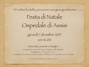 ASSISI – Festa di Natale all’ospedale di Assisi per stare vicini ai malati, a tutto il personale sanitario che si occupa di loro con cura e professionalità e ai familiari degli assistiti. E’ in programma per giovedì 7 dicembre alle ore 16 presso il nosocomio di Assisi l’inaugurazione del presepe nel giardino della struttura, accompagnata dai canti. A seguire ci sarà un momento di gioia e condivisione nel salone della Rsa (Residenza sanitaria assistita) e nei reparti dell’ospedale. L’iniziativa è promossa dall’Ufficio della Pastorale della Salute della diocesi di Assisi – Nocera Umbra – Gualdo Tadino che invita tutti a partecipare a questo momento per stare vicino a chi è nella sofferenza.