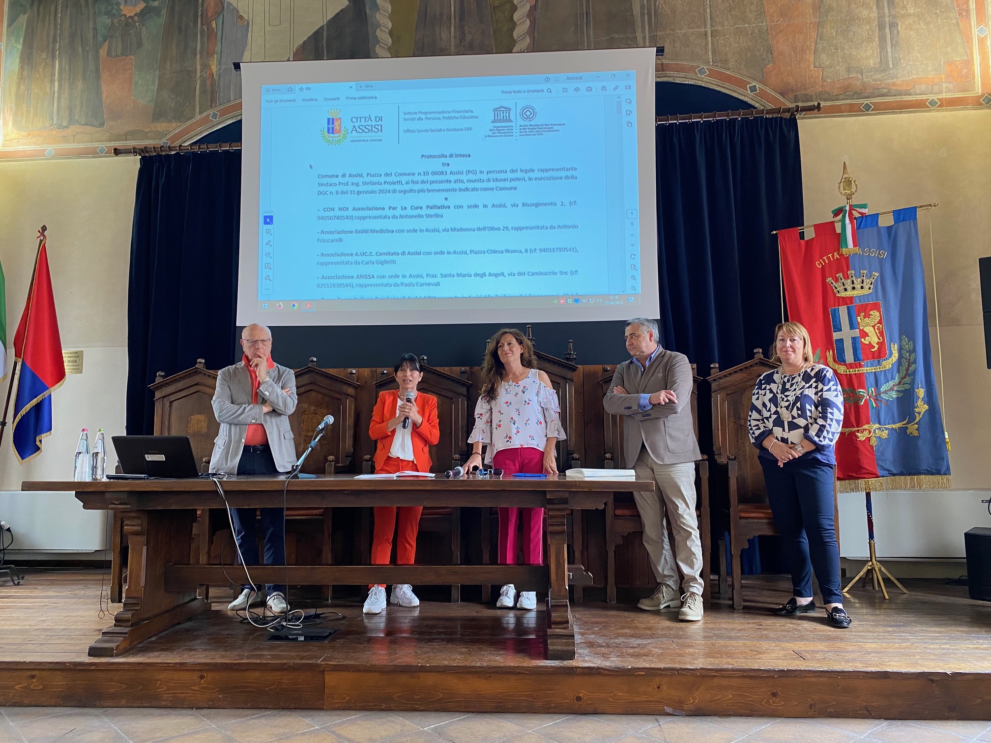 Nella Sala della Conciliazione è stato siglato un protocollo di intesa tra il Comune di Assisi e 12 associazioni di volontariato che operano sul territorio (Con Noi- associazione per le cure palliative, Assisi Medicina, Aucc, Angsa, Croce rossa italiana, Aido, Vi,Va., Auser, La Zattera, A.n.n.a., Avis, Confraternita Misericordia).