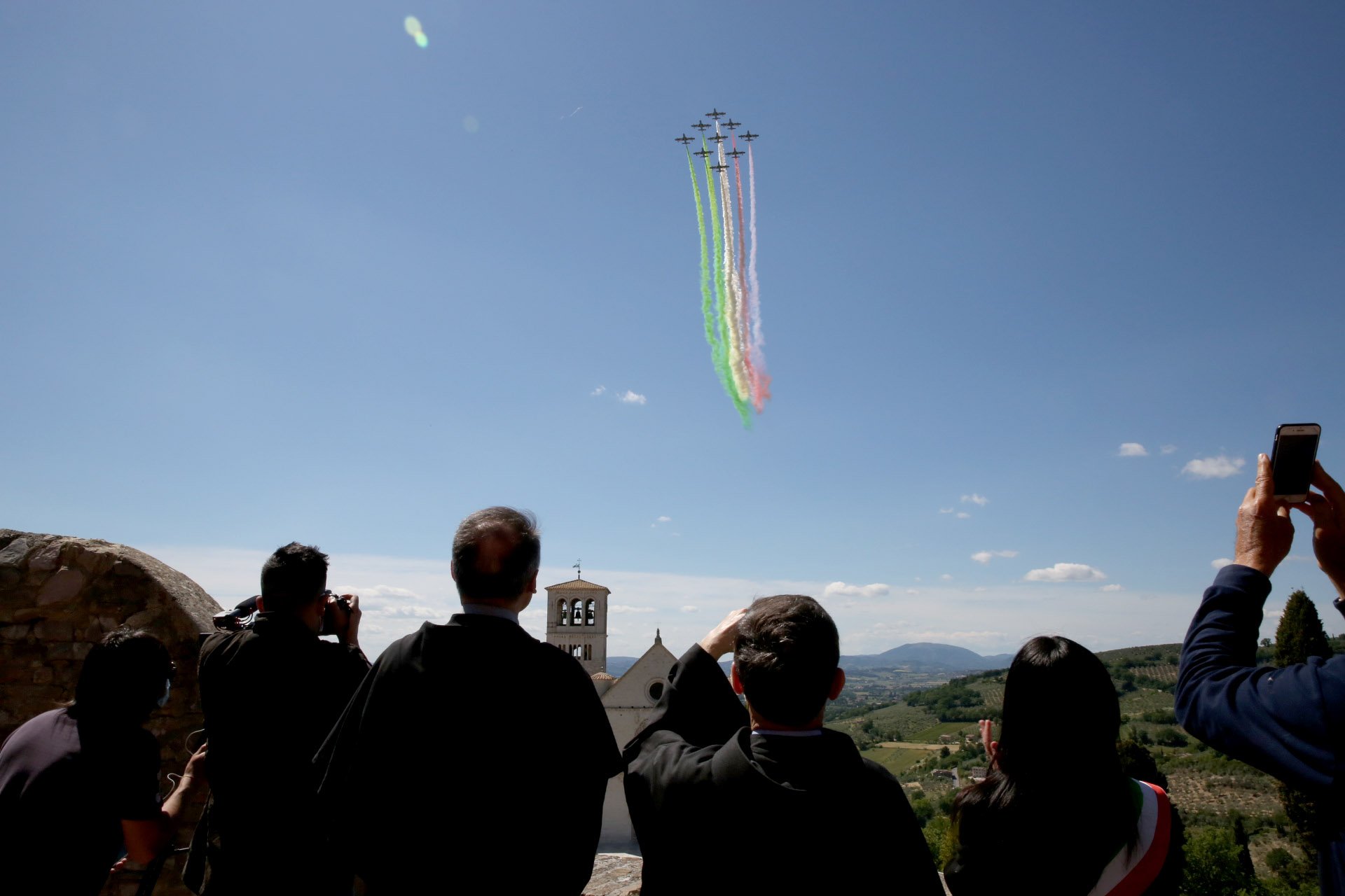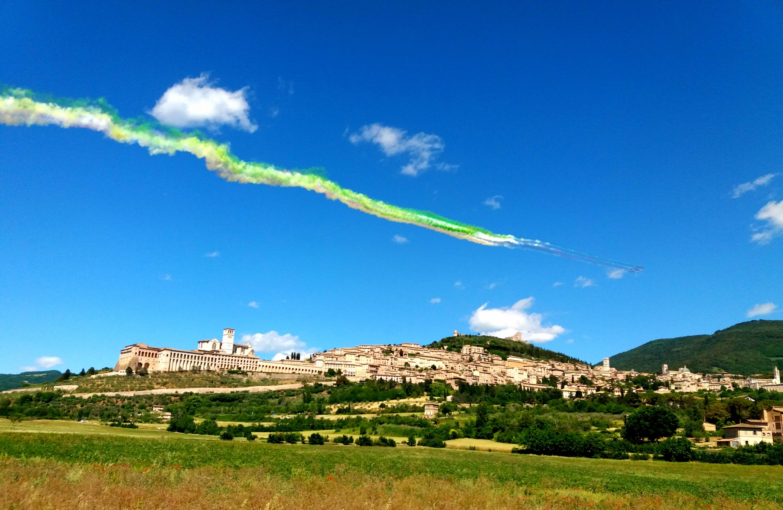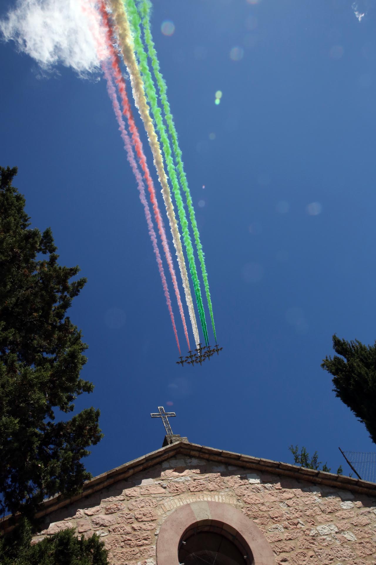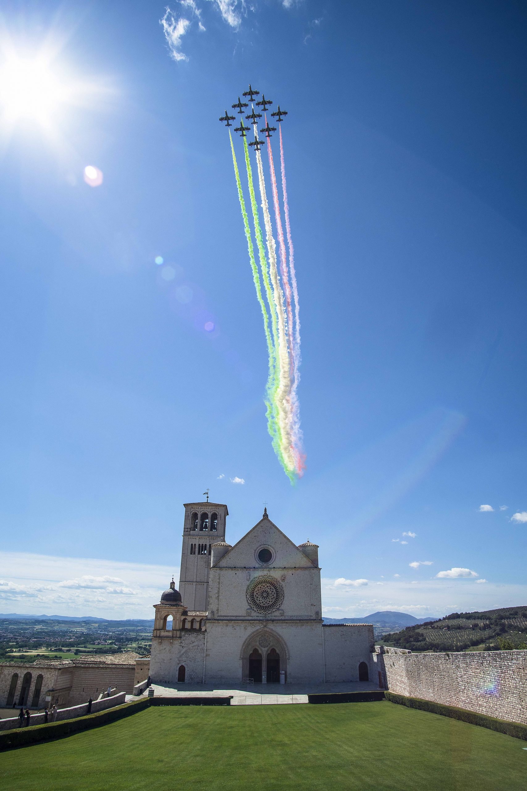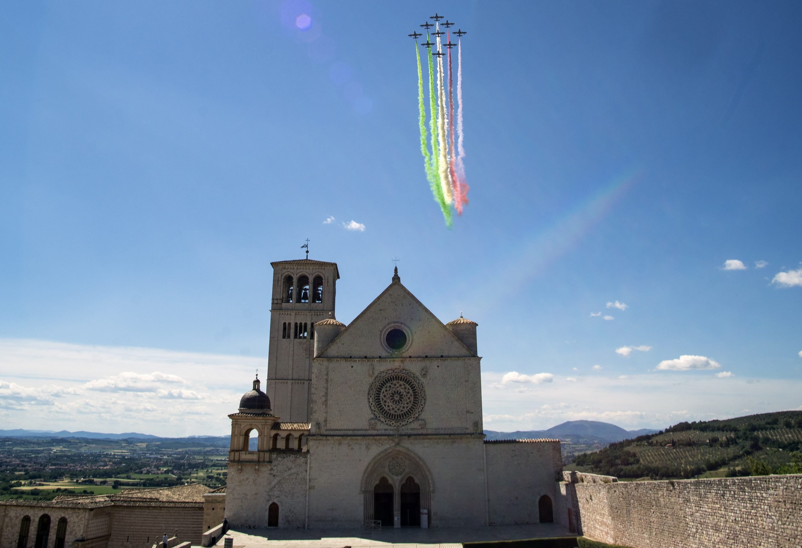 Foto del passaggio delle Frecce Tricolori sulla Basilica di San Francesco d’Assisi, un omaggio al Patrono d’Italia.