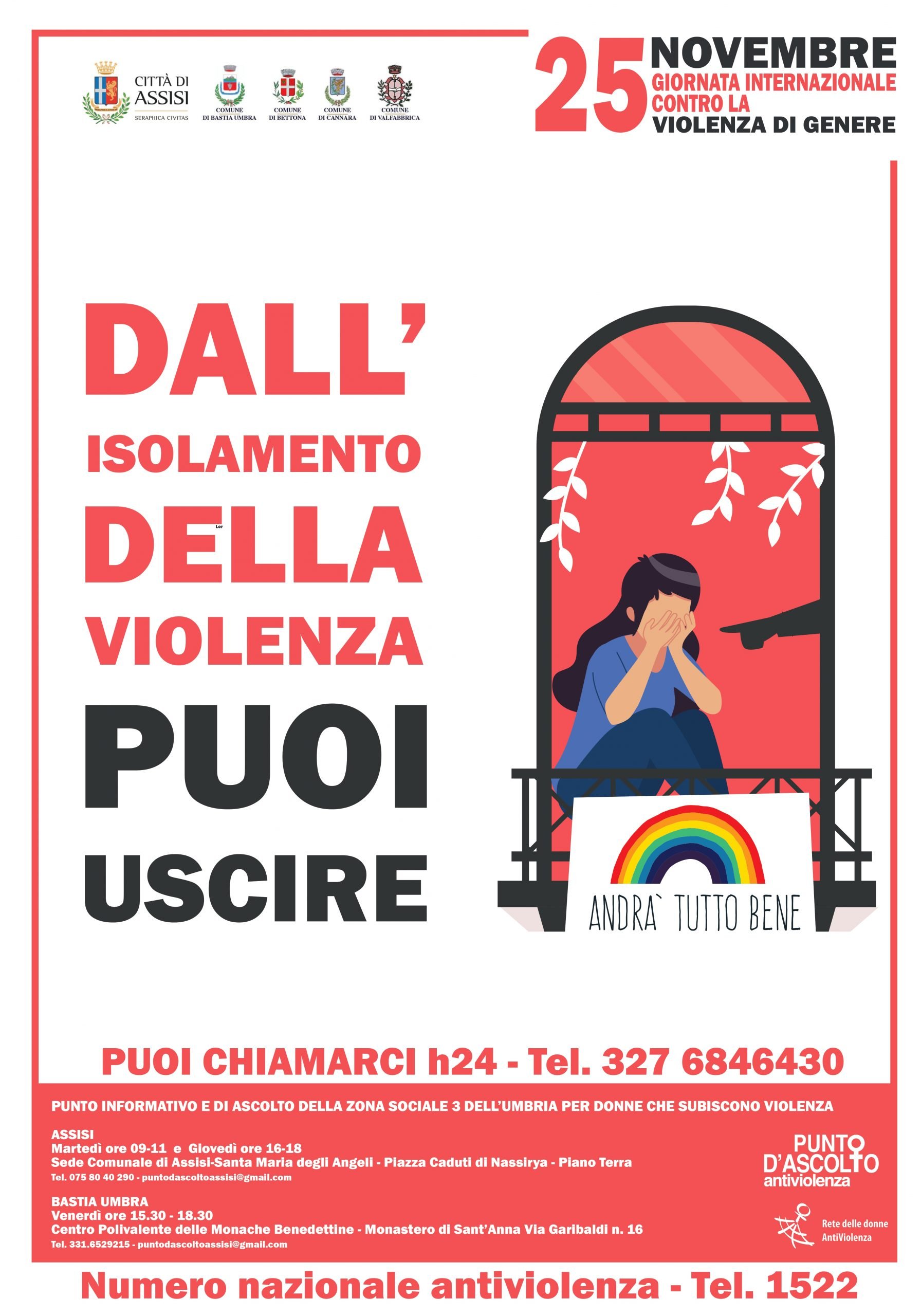 Ricordiamo inoltre che è sempre attivo a Bastia Umbra lo Sportello antiviolenza, una iniziativa della zona sociale 3 dell’Umbria con il contributo del Comune di Bastia Umbra dedicata alle donne che subiscono violenza, in collaborazione con RAV (Rete delle Donne antiviolenza) il venerdì dalle ore 15.30 alle ore 18.30 presso il Centro Polivalente del Monastero Benedettino di S. Anna in Via Garibaldi, per appuntamento telefonare al numero 331 6529215 o scrivere e-mail al puntodascoltoassisi@gmail.com