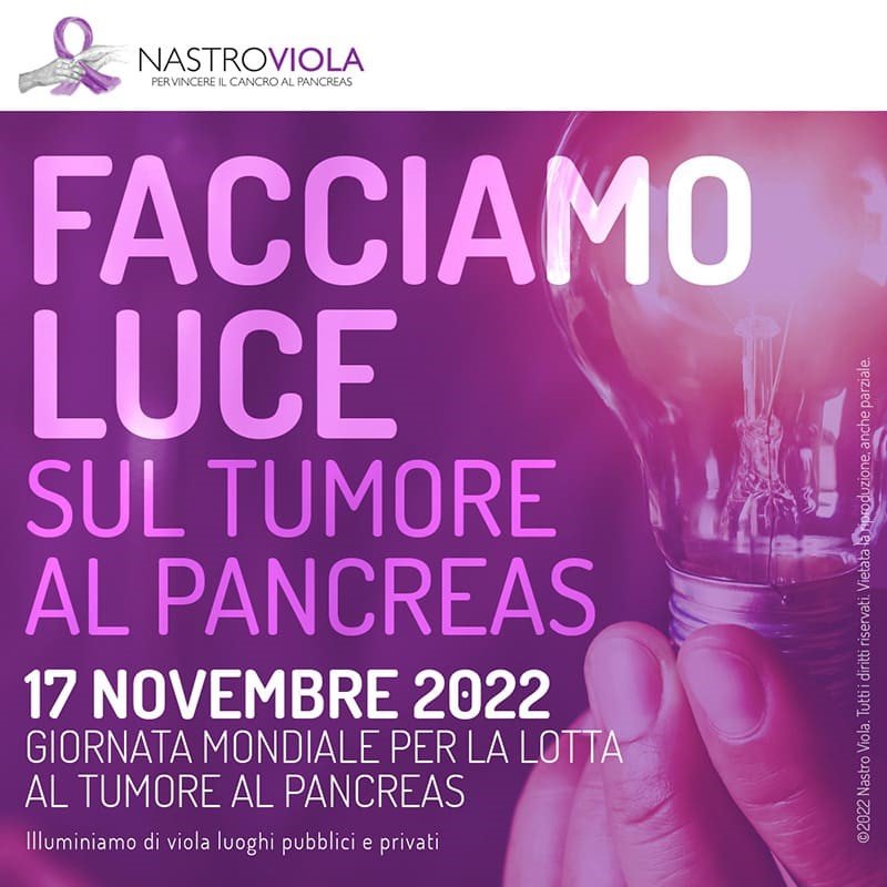 Promossa dall’Associazione Nastro Viola Onlus, con la collaborazione della “World pancreatic cancer coalition” la campagna “Facciamo luce sul tumore al pancreas” ispirata alla “Light it Purple” è arrivata in Italia nel 2016 e ha riscosso un successo sempre crescente: grazie al tam tam di pazienti e familiari e all’impegno di istituzioni pubbliche e private l’anno scorso sono stati oltre 150 i Comuni italiani che hanno aderito all’iniziativa che nel mondo coinvolge luoghi suggestivi come le Cascate del Niagara o l’Opera House di Sidney.