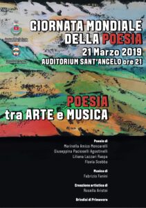 In occasione della Giornata Mondiale della Poesia è in programma, Giovedì 21 marzo 2019, presso l’Auditorium Sant’Angelo, (ore 21,00), l’evento “Poesia tra Arte e Musica” con la lettura delle Poesie di Marinella Amico Mencarelli, Giuseppina Pacioselli Agostinelli, Liliana Lazzari Raspa, Flavia Scebba. Le stesse liriche saranno di ispirazione sia alle musiche – eseguite contestualmente alle letture e composte appositamente dal musicista Fabrizio Fanini – che alla creazione artistica di Rosella Aristei, la quale darà forma ad un’opera sulla base delle sensazioni scaturite dall’ascolto dei testi poetici.