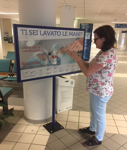 “A partire dal febbraio 2018 – sottolinea la dottoressa Gioia Calagreti, responsabile scientifica del corso di formazione e dirigente medico del servizio di rischio clinico aziendale – abbiamo installato numerosissimi cartelli e relativi dispenser, negli ingressi di tutti ospedali, nelle sale di attesa, nelle corsie di degenza e in tutti i luoghi più strategici dell’Usl Umbria 1. In particolare accanto ai dispenser contenenti gel-idroalcolico vi è un remind grafico sulla modalità corretta del lavaggio delle mani e sui momenti in cui è importante rincorrervi. L’installazione dei dispenser è stata estesa anche alle principali strutture territoriali, come le residenze sanitarie assistite (RSA), le residenze protette (RP), l’Hospice di Perugia e ai centri di salute afferenti ad ogni Distretto della Usl. Gli operatori sanitari all’interno delle strutture ospedaliere e territoriali della Usl, ma anche quelli che assistono pazienti al domicilio, inoltre, hanno a disposizione anche confezioni tascabili di gel idroalcolico da tenere con sé e da utilizzare nei momenti appropriati”.