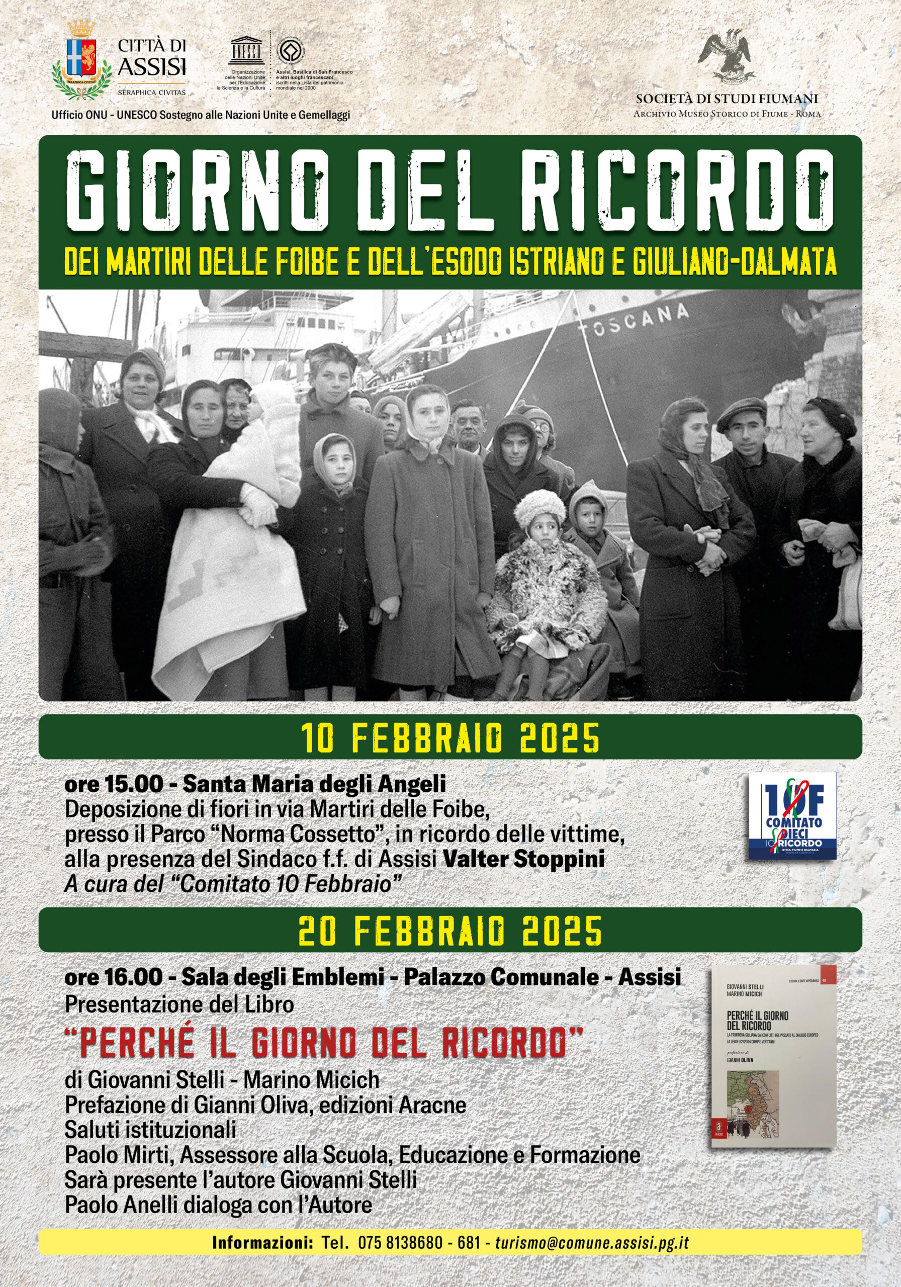 Il 20 febbraio, alle ore 16.00, ad Assisi (Sala degli Emblemi, Palazzo Comunale), ci sarà la presentazione del libro “Perché il Giorno del Ricordo” di Giovanni Stelli e Marino Micich. Sarà presente l’autore Stelli, che dialogherà con Paolo Anelli, studioso dell’esodo Giuliano-Dalmata. Porterà i saluti istituzionali Paolo Mirti, assessore a scuola, educazione e formazione.
