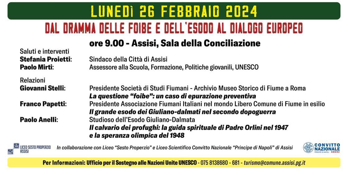 Il 26 febbraio, alle 9, ad Assisi (Sala della Conciliazione, Palazzo dei Priori) si terrà un incontro intitolato “Dal dramma delle foibe e dell’esodo al dialogo europeo”.