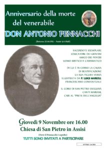 ASSISI – A 169 anni dalla morte (9-11-1848) Assisi ricorda il venerabile don Antonio Pennacchi, sacerdote della diocesi, per il quale è in corso la causa di beatificazione. E lo fa con un incontro in programma giovedì 9 novembre alle ore 16 nella chiesa di San Pietro dove egli è sepolto. Si tratterà di un momento, organizzato dal postulatore della causa di beatificazione don Orlando Gori, per ricordare questo sacerdote esemplare, educatore dei giovani, amico dei poveri, uomo mistico e carismatico. La sua figura sarà illustrata da padre Luigi Marioli, francescano conventuale che ha approfondito la sua vita. Durante l’incontro il coro di San Pietro eseguirà canti mariani cari al “prete dell’Angelus”. Rimane infatti ben viva specie tra i sacerdoti la fama di santità del venerabile servo di Dio, la cui figura suscita ai nostri giorni un rinnovato interesse anche fra i laici. Don Antonio Pennacchi è nato a Bettona nel 1782 e vissuto in Assisi, nella parrocchia di San Pietro dove ora, come detto, si trova la sua tomba. La vita di don Pennacchi è ricca di spunti e di momenti di grande spiritualità. Si sentì chiamato dal Signore alla vocazione sacerdotale e a 18 anni, all’inizio del 1800 si trasferì in Assisi per continuare gli studi filosofici e teologici. Si distinse subito per la sua intelligenza, per il suo impegno e per la pietà. Fu ordinato sacerdote il 22 marzo 1806 dal vescovo Francesco Maria Giampé che, per la sua grande cultura, lo nominò insegnante di grammatica superiore nelle scuole municipali di Assisi e cappellano nella chiesa abbaziale di San Pietro e delle suore clarisse francescane di Sant’Andrea. Il fondamento della sua spiritualità sarà il mistero dell’Annunciazione e dell’Incarnazione del Figlio di Dio e per tutta la sua vita sarà l’apostolo dei nomi di Gesù e Maria. Da qui nascerà il suo amore alla povertà, alla preghiera, all’umiltà e penitenza sull’esempio di San Francesco. Il suo campo di lavoro fu l’assistenza e la formazione dei ragazzi, dei giovani e l’amore, l’aiuto ai poveri, ai malati, con i quali divideva il suo stipendio di insegnante. Come San Filippo si circondò di ragazzi che raccoglieva dalle strade e fu il giullare di Dio. In mezzo al popolo, il prete dell’Angelus Domini, il predicatore del Vangelo, il testimone delle virtù evangeliche. Subì vessazioni dal demonio e secondo le testimonianze di persone meritevoli di fiducia, nel suo ministero operò segni straordinari ed ebbe dono della bilocazione. Povero e umile morì il 9 novembre 1848, considerato dal popolo e dal clero un santo. Numerosi, anche dai paesi vicini, accorsero a venerare la sua salma e ai solenni funerali, celebrati nella chiesa di San Pietro. La causa di beatificazione, aperta nel 1905 dalla Santa Sede, per contingenze storiche e inadempienze diocesane, non ebbe seguito e solo nel giugno del 2016 è stata riavviata con un decreto del vescovo di Assisi – Nocera Umbra – Gualdo Tadino monsignor Domenico Sorrentino proprio perché don Antonio Pennacchi venga elevato agli onori degli altari.Assisi, 04 novembre ’17