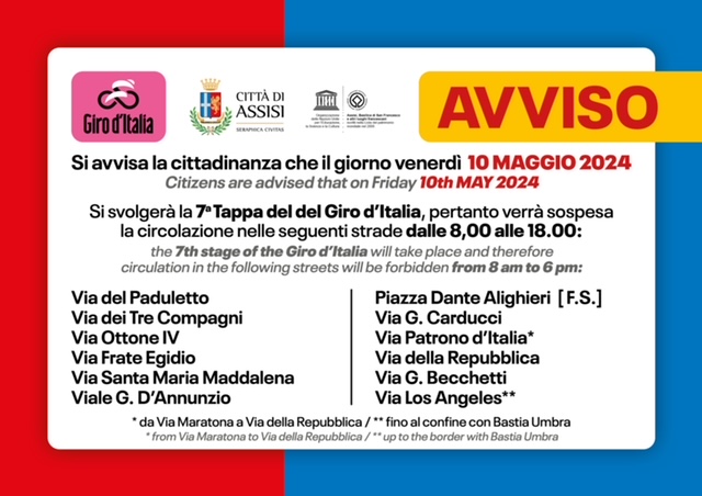 In vista del grande evento ciclistico, la Città di Assisi accoglie l’arrivo del Giro d’Italia che porterà Assisi all’attenzione di centinaia di migliaia di spettatori internazionali, saluta gli sportivi e gli organizzatori della rinomata competizione che da oltre un secolo attira grandi e piccini, appassionati delle due ruote, ringrazia sin da ora le forze di polizia e dell’ordine nonché i volontari che aiuteranno a svolgere l’evento in sicurezza cercando di ridurre i disagi al minimo per i cittadini e i numerosi visitatori e turisti presenti in città.